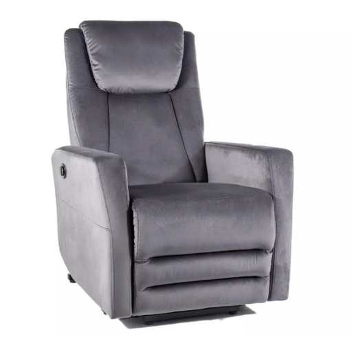 Elektromosan dönthető, függőleges fotel, állítható fejtámlával, Bluvel 14 bársony huzattal, szín: szürke. Vezetékes távirányító az ülés dőlésszögének vezérléséhez, zseb és USB töltőcsatlakozó a jobb oldalon.
