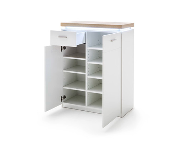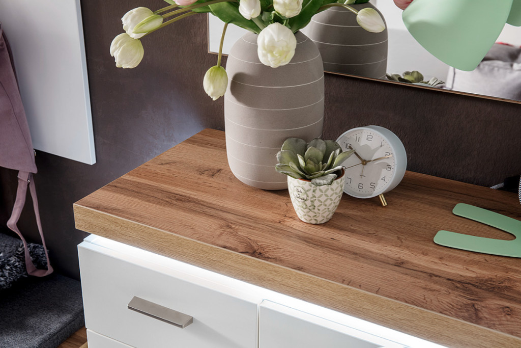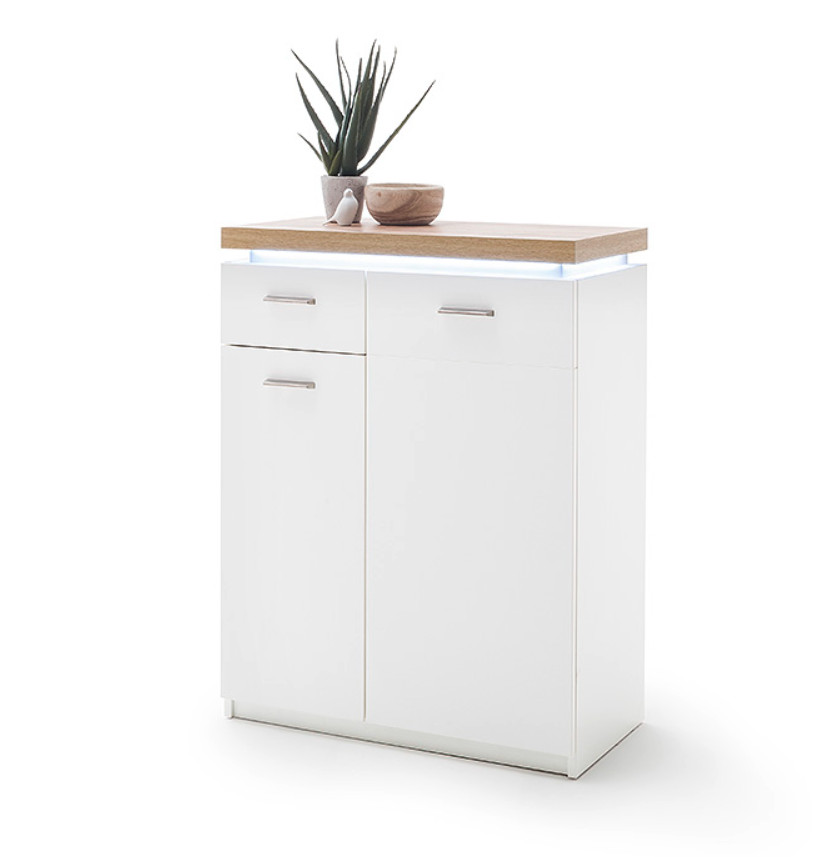 CALI komód - minimalista dizájn modern skandináv hangulattal. A bútor fehér matt felületű fóliázott pántlemezből és természetes tölgyfa (Wotan) hatású dekorral készült, amely eleganciát és melegséget hoz a térbe.