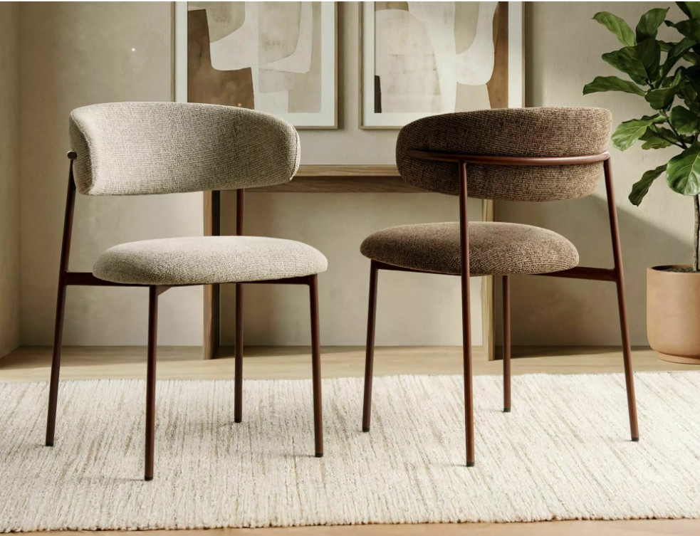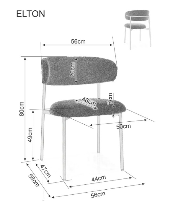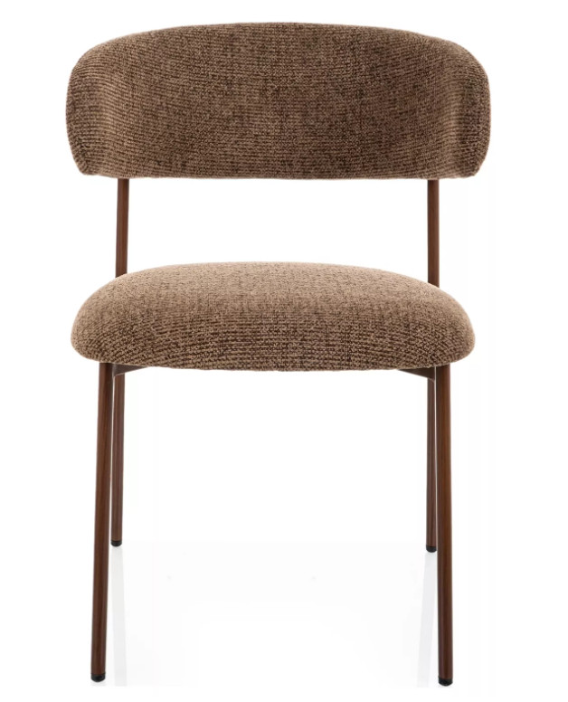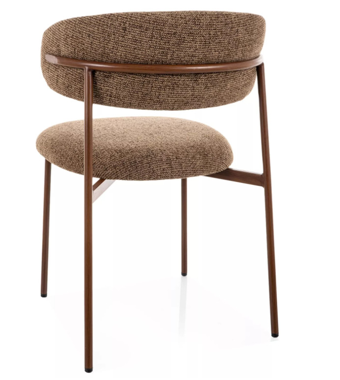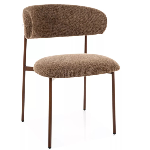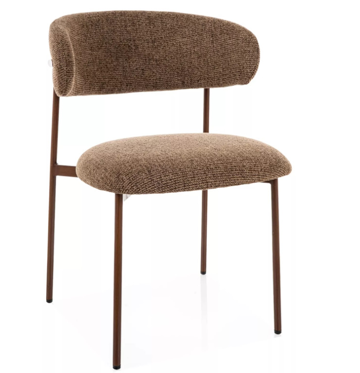 Letisztult, modern étkezőszék, amely a kényelmet és a természetes hatású megjelenést ötvözi. Kárpitozott ülőfelülete és háttámlája puha tapintású szövetből készül, így komfortos használatot biztosít mindennapi étkezésekhez vagy hosszabb beszélgetésekhez.