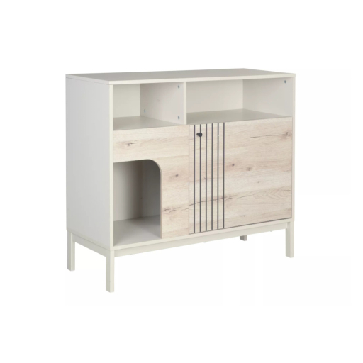 Frost K3 komód a modern skandináv dizájn és a funkcionalitás tökéletes kombinációja, amely ideális választás nappaliba, hálószobába vagy előszobába. A laminált alpesi tölgy és törtfehér színösszeállítás világos, barátságos hangulatot teremt, míg a fém lábszerkezet stabilitást és eleganciát biztosít.