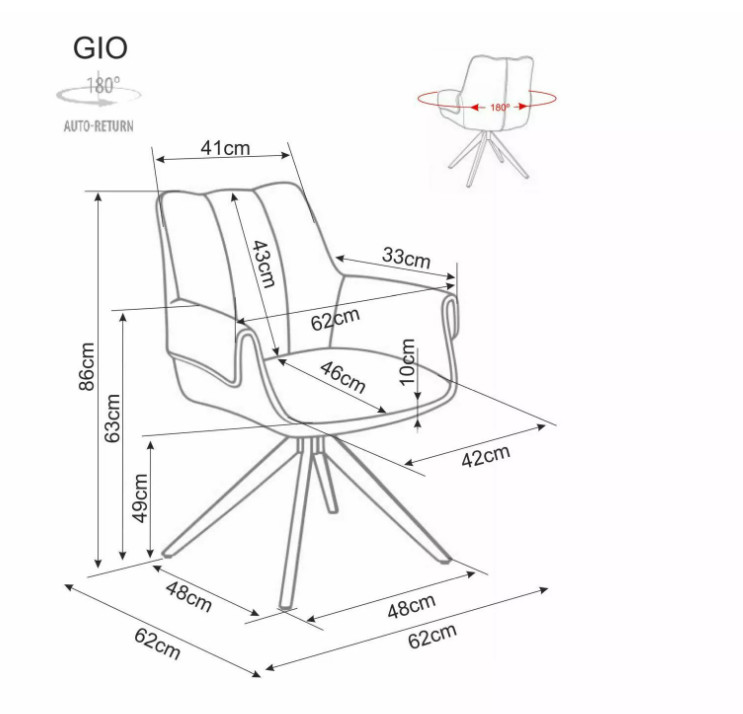 • Mérete: 86 x 49 x 62 x 46 cm ( magasság x ülésmagasság x szélesség x mélység)