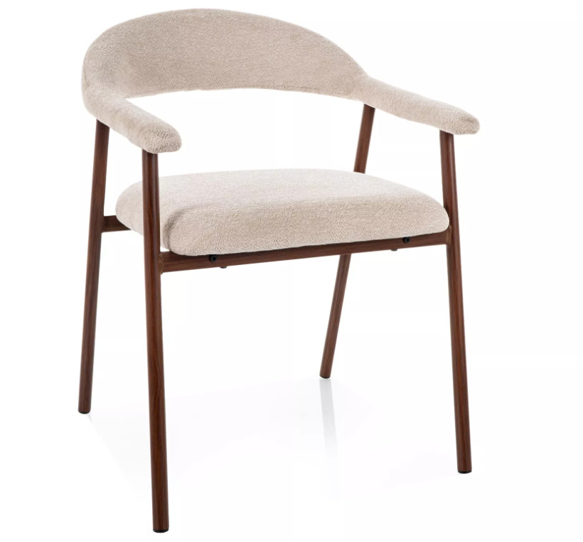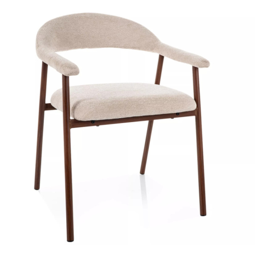 Az ergonomikusan kialakított háttámla és az integrált karfák kényelmes, „fotel jellegű” ülést biztosítanak, ami különösen előnyös hosszabb étkezések vagy beszélgetések során. A fém szerkezet fa hatású kivitelben készül, amely stabilitást ad, miközben melegebb, természetes megjelenést kölcsönöz.