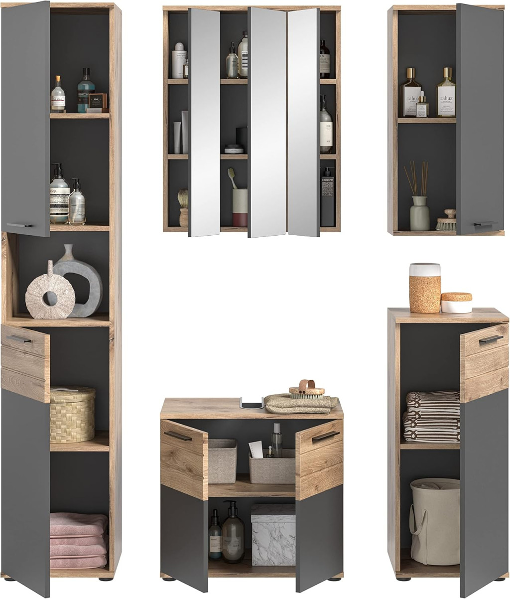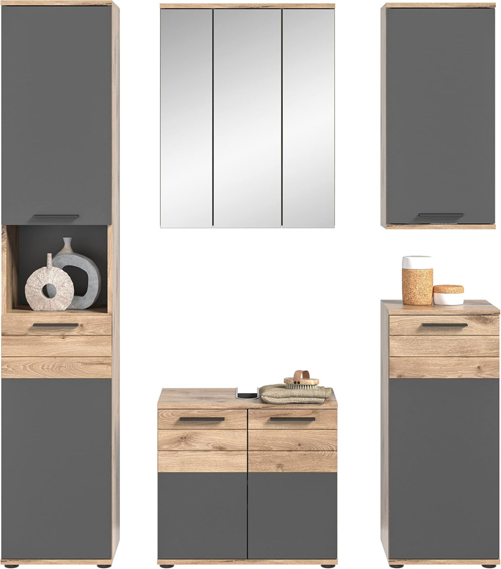 A Nox tölgyfa és bazaltszürke utánzatú fürdőszoba kombináció modern és vonzó dizájnt ötvöz. A két szín kombinációja modern esztétikát kölcsönöz a fürdőszobának, egy csipetnyi természetességgel és eleganciával. A fürdőszoba kombináció rengeteg tárolóhelyet és funkcionalitást kínál a fürdőszobai kellékek, törölközők és egyéb ápolási termékek rendszerezéséhez. A különféle szekrények és fiókok lehetővé teszik a rendelkezésre álló hely hatékony kihasználását és segítenek rendben tartani a fürdőszobát. A fürdőszoba kombináció ideális otthoni, nyaralókban, szállodákban és egyéb kereskedelmi létesítményekben való használatra. Nemcsak funkcionális tárolási megoldásokat kínál, hanem stílusos és kényelmes fürdőszobai hangulatot is teremt.