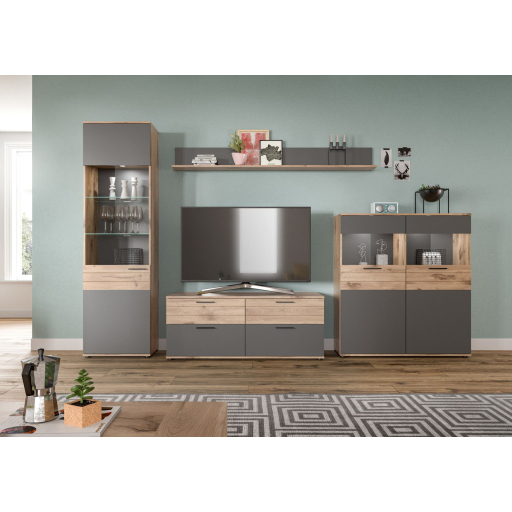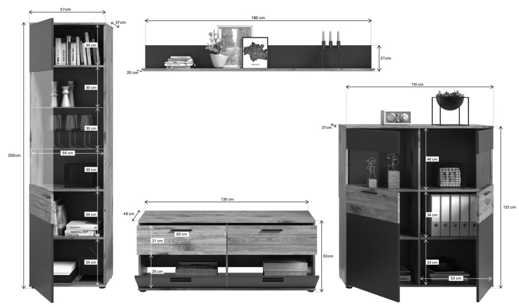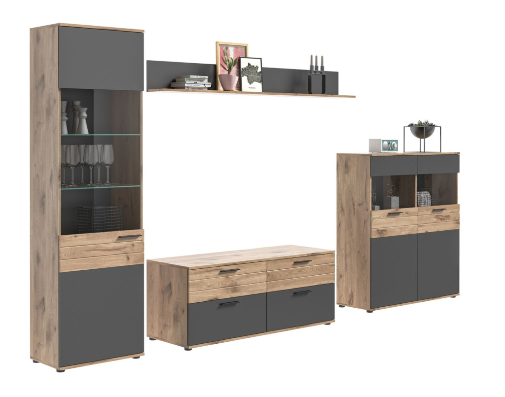 A Nox tölgy és bazaltszürke színű nappali szett modern és vonzó dizájnt kínál, amely letisztult vonalakkal és harmonikus színkombinációval nyűgöz le. A Nox tölgy és bazaltszürke utánzatok modern esztétikát kölcsönöznek a nappali szettnek, és lehetővé teszik, hogy jól mutasson a különböző berendezési stílusokban. A nappali szett elegendő tárolóhelyet és funkcionalitást kínál a szoba számára. Különböző elemekből áll, mint például szekrények, polcok és vitrinek, amelyek sokoldalú tárolási lehetőségeket kínálnak könyvek, dísztárgyak, multimédiás eszközök és egyebek számára. A bútorok átgondolt elrendezése és felosztása lehetővé teszi a rendelkezésre álló tér hatékony kihasználását. A garnitúrák kiváló minőségű anyagokból készültek, és robusztus konstrukció jellemzi azokat. A Nox tölgy és a bazalt szürke színek könnyen kezelhetők és tartósak, ami megkönnyíti a tisztítást és a karbantartást. Ez azt jelenti, hogy a nappali szett hosszú távon első osztályú állapotban marad, és csak minimális karbantartást igényel.
