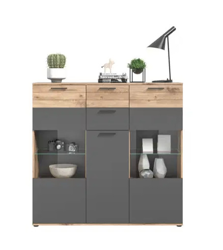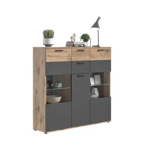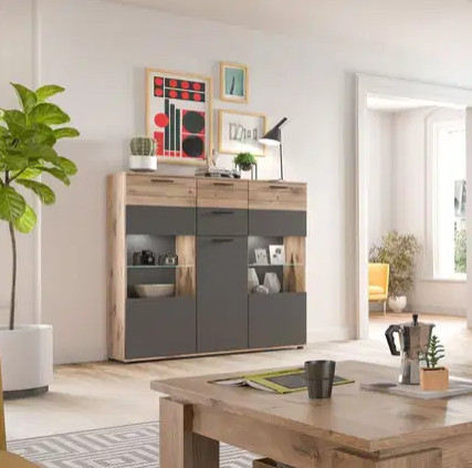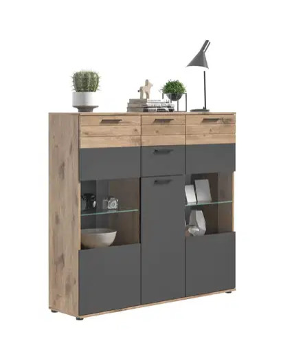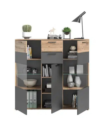 A Nox tölgyfa és bazaltszürke tálalószekrény modern és sokoldalú dizájnt kínál, amely zökkenőmentesen illeszkedik különféle helyiségekbe, például dolgozószobába, fürdőszobába, előszobába, étkezőbe, előszobába, háztartási helyiségbe, hobbiszobába, ifjúsági szobába, pincébe, gyerekszobába, konyhába, hálószobába, műhelybe és nappaliba. A két szín kombinációja modern esztétikát kölcsönöz a bútordarabnak, míg a letisztult vonalak és a minimalista dizájn elegáns megjelenést biztosít.A magas szekrény rengeteg tárolóhelyet és helyet kínál különféle tárgyak, például edények, könyvek, ruhák, szerszámok, játékok és sok más tárolására. Fiókokkal, rekeszekkel és/vagy ajtókkal rendelkezik, amelyek lehetővé teszik a rendezett tárolást és a könnyű hozzáférést. A magas szekrény ideális a ház vagy lakás különböző helyiségeiben való felhasználásra. Stílusos tárolóegységként szolgálhat, ugyanakkor funkcionális kiegészítője is lehet a szoba kialakításának.