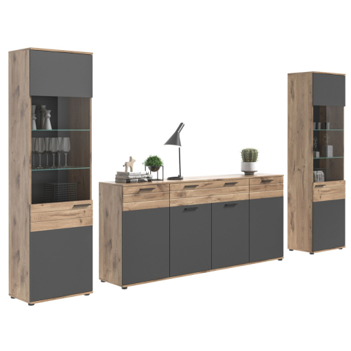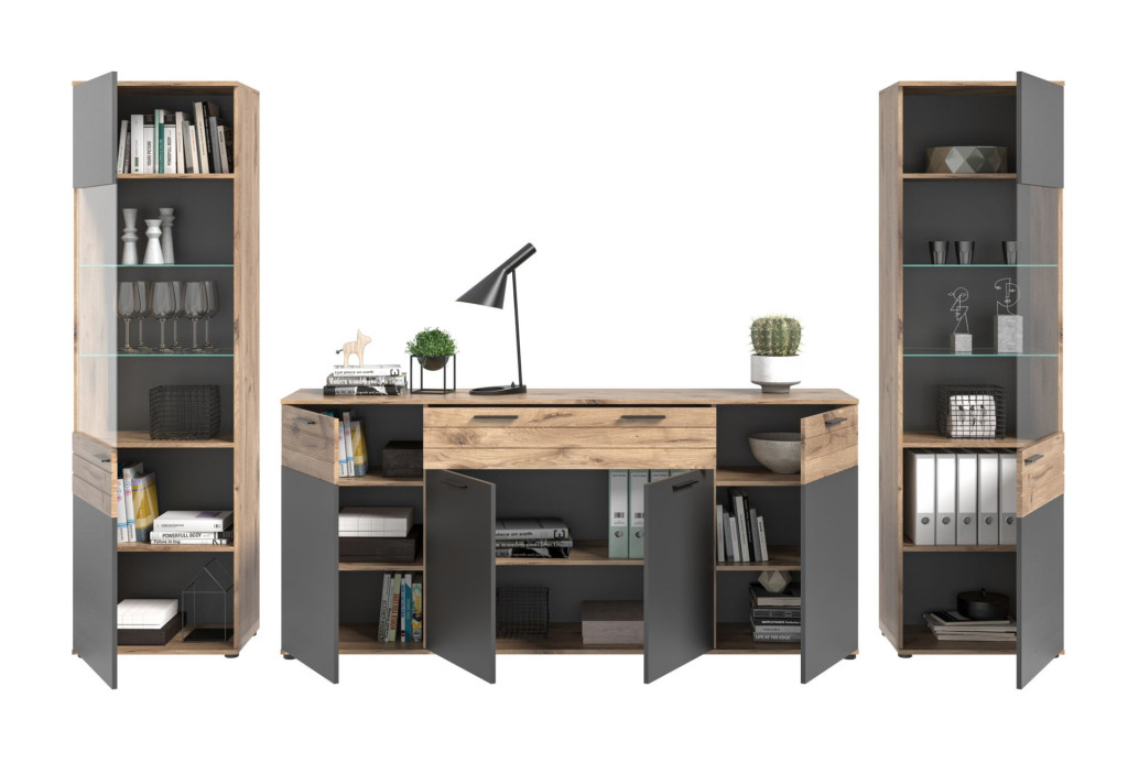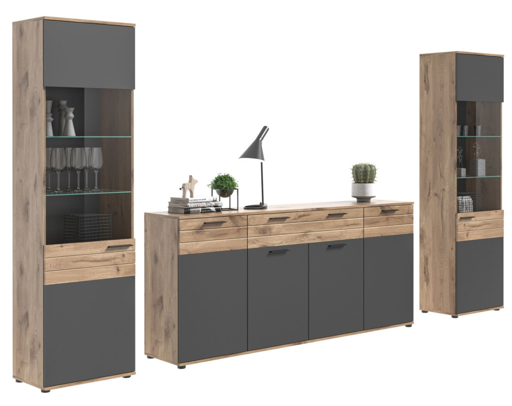 A Nox tölgy és bazaltszürke színű nappali szett modern és vonzó dizájnt kínál, amely letisztult vonalakkal és harmonikus színkombinációval nyűgöz le. A Nox tölgy és bazaltszürke utánzatok modern esztétikát kölcsönöznek a nappali szettnek, és lehetővé teszik, hogy jól mutasson a különböző berendezési stílusokban. A nappali szett elegendő tárolóhelyet és funkcionalitást kínál a szoba számára. Különböző elemekből áll, mint például szekrények, polcok és vitrinek, amelyek sokoldalú tárolási lehetőségeket kínálnak könyvek, dísztárgyak, multimédiás eszközök és egyebek számára. A bútorok átgondolt elrendezése és felosztása lehetővé teszi a rendelkezésre álló tér hatékony kihasználását. A garnitúrák kiváló minőségű anyagokból készültek, és robusztus konstrukció jellemzi azokat. A Nox tölgy és a bazalt szürke színek könnyen kezelhetők és tartósak, ami megkönnyíti a tisztítást és a karbantartást. Ez azt jelenti, hogy a nappali szett hosszú távon első osztályú állapotban marad, és csak minimális karbantartást igényel.