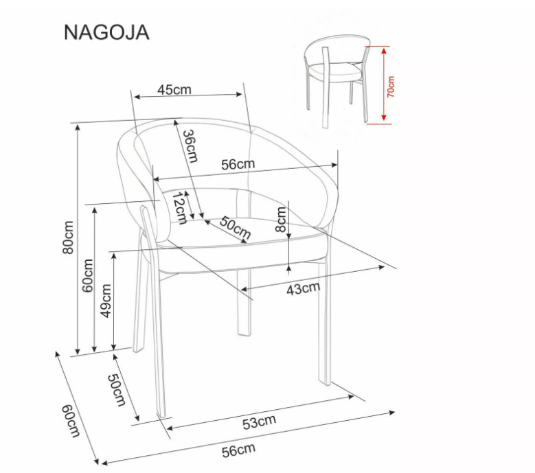 • Mérete: 80 x 49 x 56 x 50 cm ( magasság x ülésmagasság x szélesség x mélység)