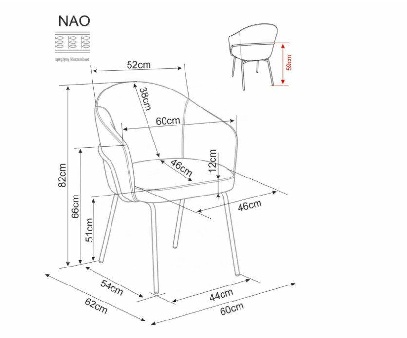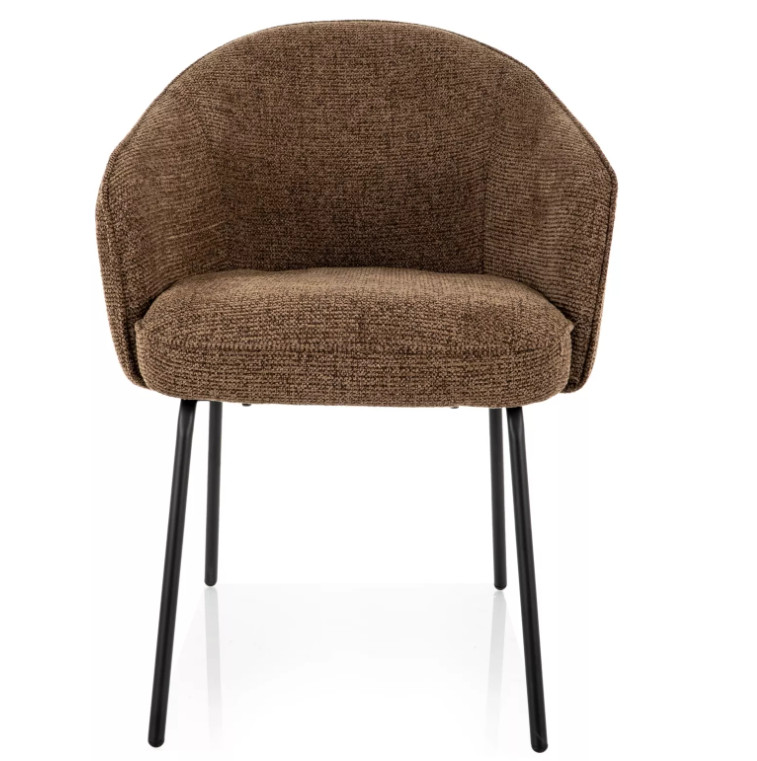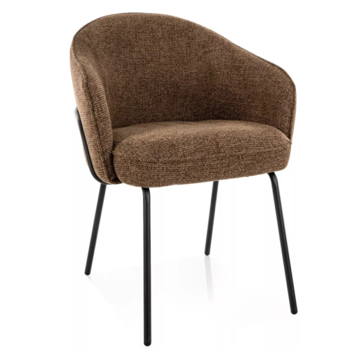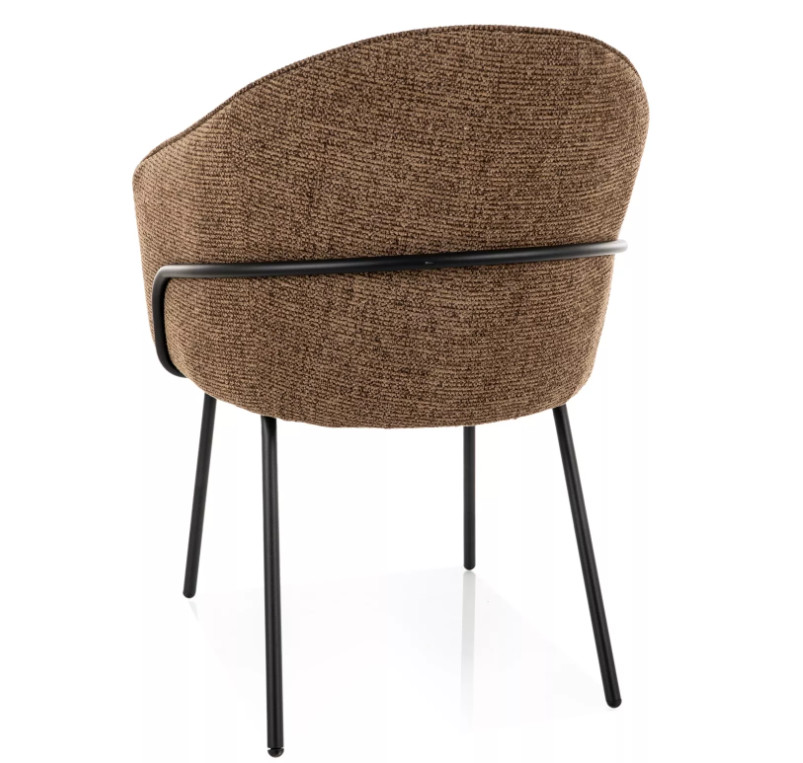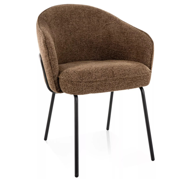 Az integrált karfák és az enyhén ívelt háttámla kényelmes, „fotel jellegű” ülést adnak, így étkezőben és nappaliban is jól használható. A fekete, matt fém lábszerkezet stabil tartást biztosít, miközben modern, kontrasztos megjelenést ad a bútornak.