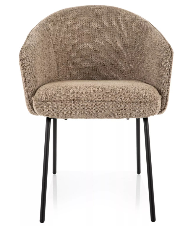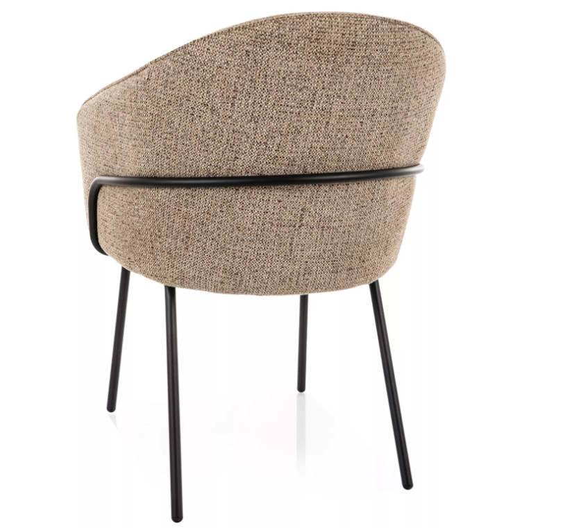 Az integrált karfák és az enyhén ívelt háttámla kényelmes, „fotel jellegű” ülést adnak, így étkezőben és nappaliban is jól használható. A fekete, matt fém lábszerkezet stabil tartást biztosít, miközben modern, kontrasztos megjelenést ad a bútornak.
