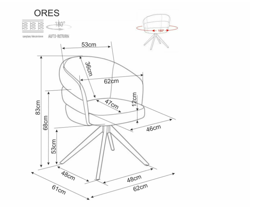 • Mérete: 83 x 53 x 47 x 62 cm ( magasság x ülésmagasság x ülésmélység x szélesség)