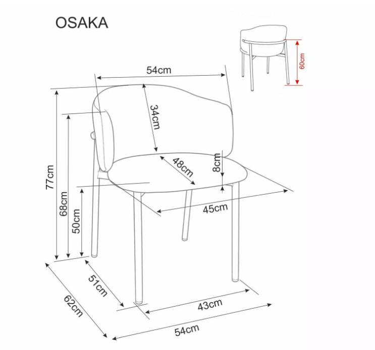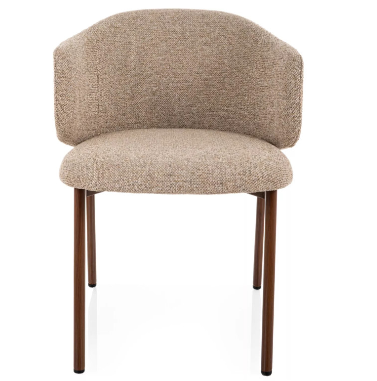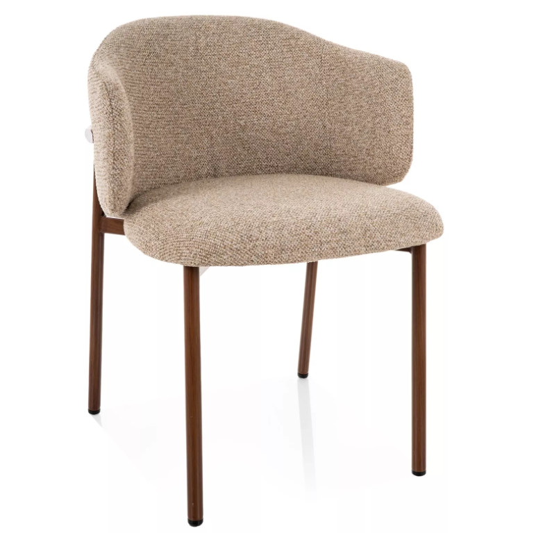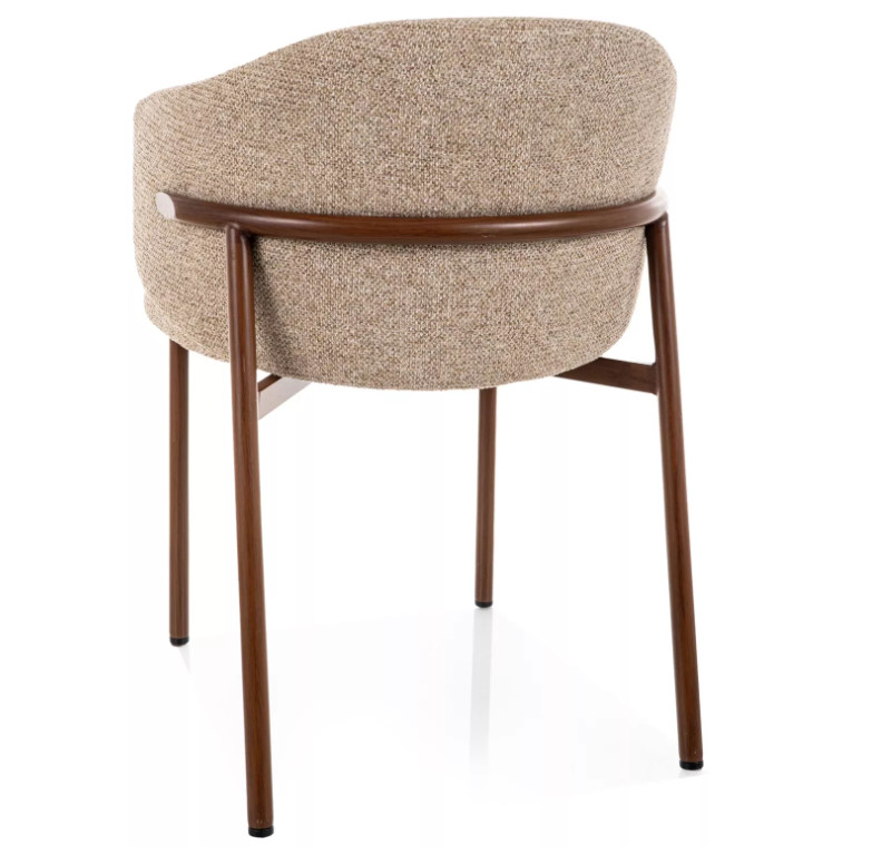 Az enyhén ölelő, ívelt háttámla és az integrált karfák ergonomikus üléspozíciót biztosítanak, így hosszabb étkezések vagy beszélgetések során is kényelmes marad. A stabil, diószínű fém váz modern karaktert ad, miközben megbízható tartást nyújt.