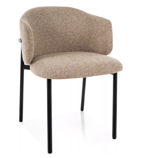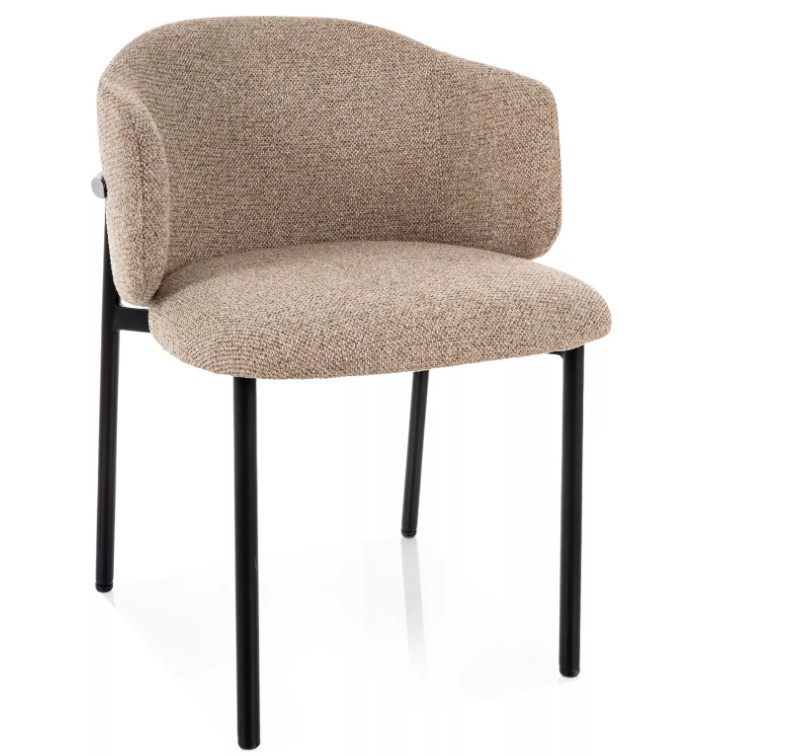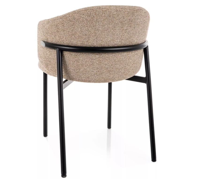 Az enyhén ölelő, ívelt háttámla és az integrált karfák ergonomikus üléspozíciót biztosítanak, így hosszabb étkezések vagy beszélgetések során is kényelmes marad. A stabil, matt fekete fém váz modern karaktert ad, miközben megbízható tartást nyújt.