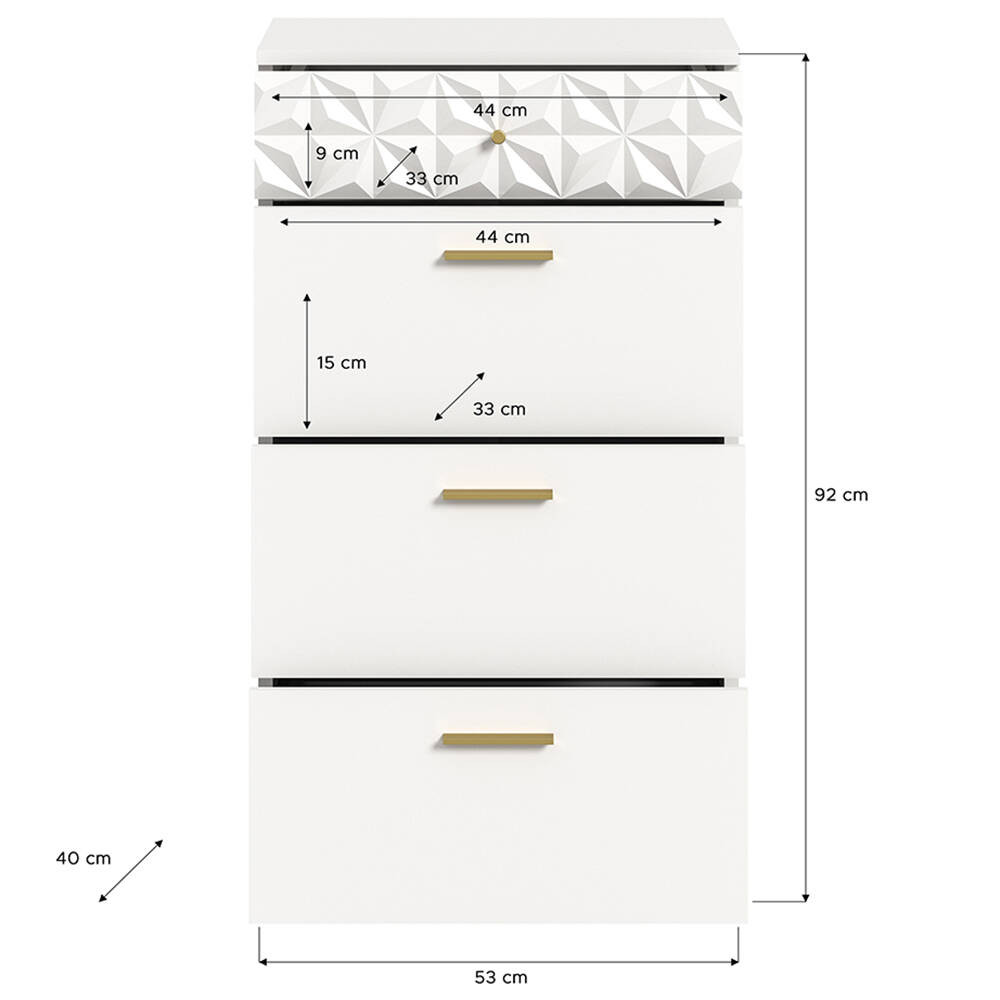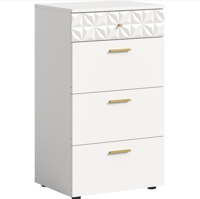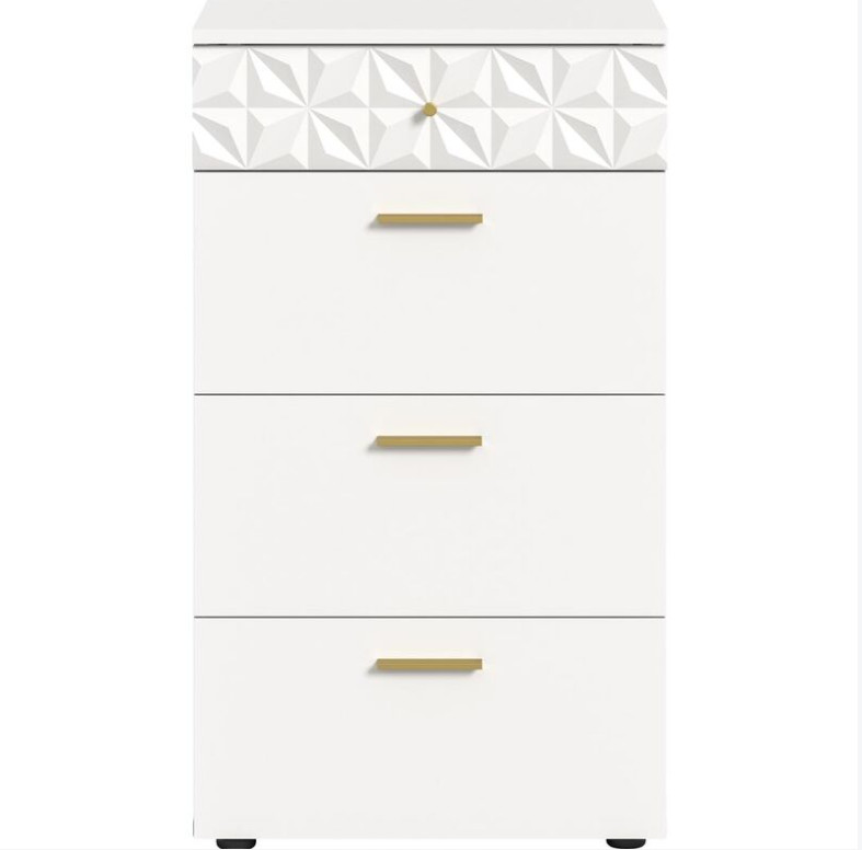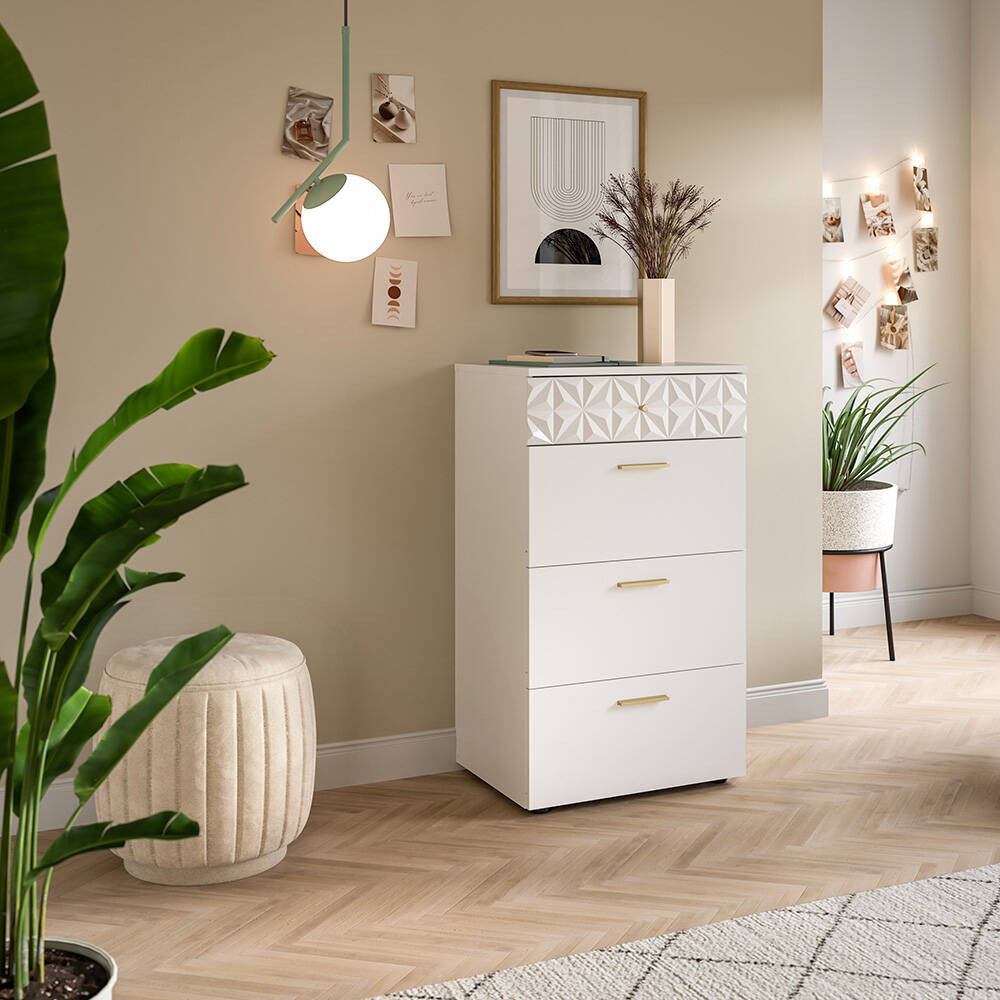 A fehér melamin és fehér magasfényű fiókos szekrény modern és minimalista dizájnjával lenyűgöző. A matt és fényes felületek kombinációja modern esztétikát kölcsönöz neki, míg a letisztult vonalak és az egyszerű formák elegáns megjelenést biztosítanak, amely különböző belső stílusokhoz illik. A komód praktikus tárolóhelyet kínál fiókokkal és rekeszekkel, hogy ruhákat, kiegészítőket vagy egyéb tárgyakat rendezetten tárolhassunk. Kompakt méretének köszönhetően kisebb helyiségekben is elfér, és sokféleképpen használható, legyen szó fürdőszobáról, tinédzser szobáról, hálószobáról vagy lakásról. A sokoldalú fiókos szekrény ideális különféle helyiségekbe, például fürdőszobába, gyerekszobába, hálószobába vagy lakásba, ahol funkcionális bútordarabként szolgál ruhák és egyéb tárgyak tárolására és rendszerezésére.