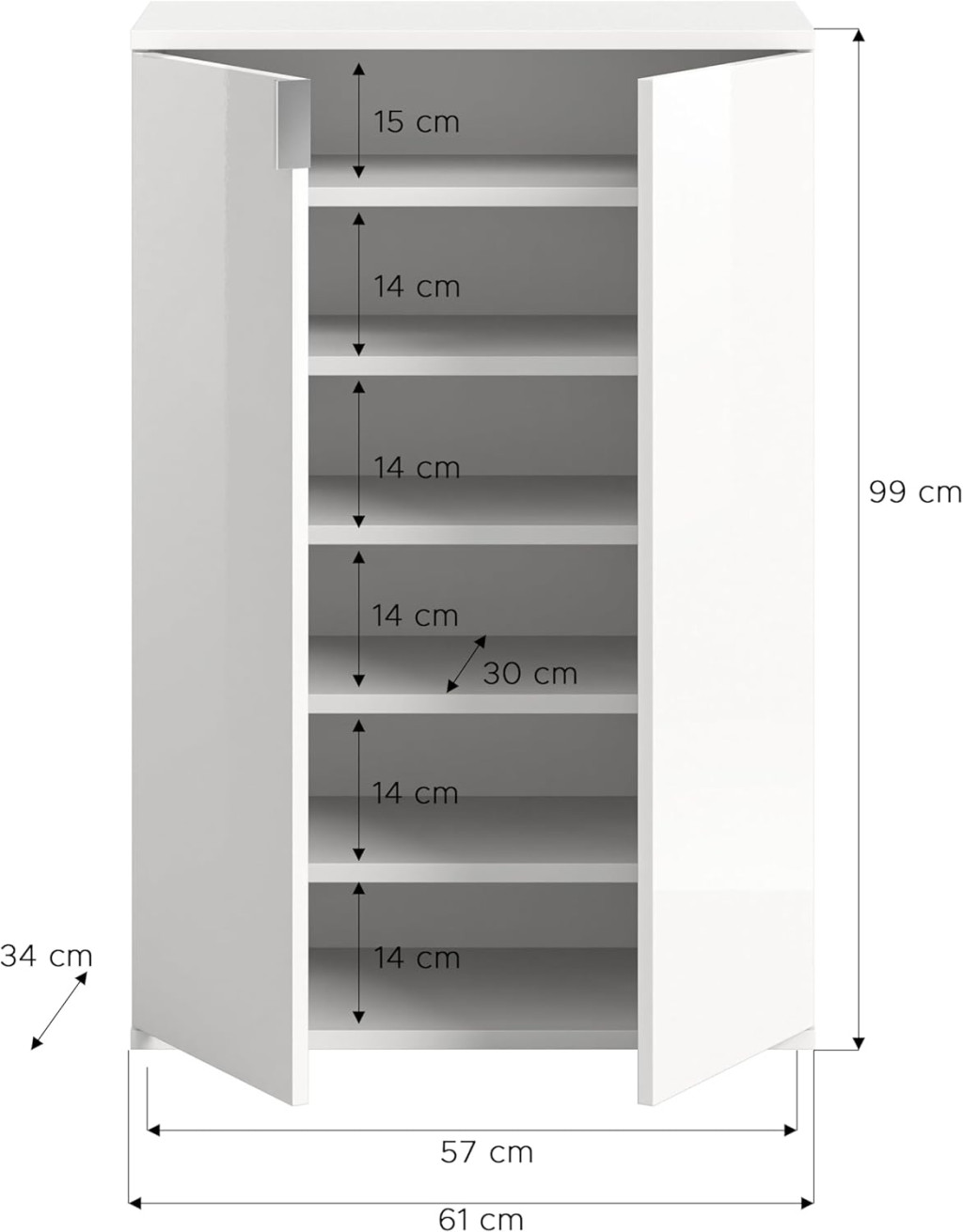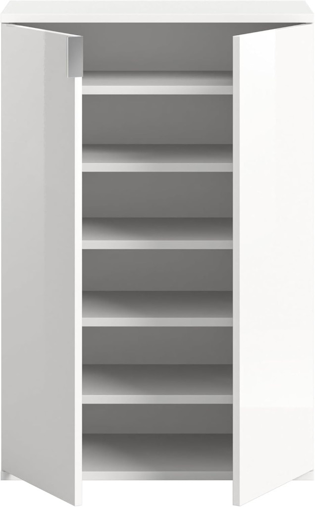A cipősszekrény időtlen és elegáns dizájnnal rendelkezik, fehér és fényes, magasfényű felülettel. A letisztult vonalak és az egyszerű megjelenés modern és vonzó hangulatot kölcsönöz a helyiségnek. A cipőszekrény praktikus tárolási megoldást kínál cipők és egyéb kiegészítők számára. Több rekesszel rendelkezik, így elegendő helyet biztosít a különböző cipőpárok rendezett tárolására, és gyors hozzáférést biztosít a lábbelihez. Sokoldalúan használható előszobában, háztartási helyiségben, irodában vagy hálószobában, a cipőszekrény praktikus és helytakarékos tárolási lehetőséget kínál cipők és kiegészítők számára, és harmonikusan illeszkedik a különböző lakóterekbe.