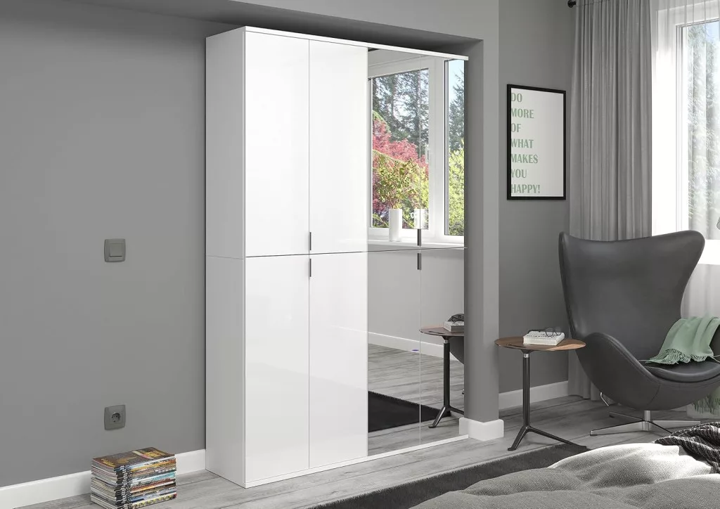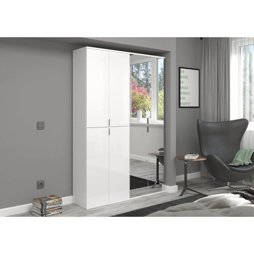 A fehér és magasfényű fehér színű gardróbszekrény-kombináció modern eleganciát sugároz, amit a fényes felület és a letisztult vonalak hangsúlyoznak. A magasfényű felület vonzó és modern megjelenést kölcsönöz a bútordarabnak, míg a fehérutánzat friss és világos összhatást biztosít. Ez az egyszerű, mégis stílusos dizájn jól illik különböző belső stílusokhoz, és világos, szellős hangulatot kölcsönöz a helyiségnek. Különböző tárolási lehetőségeivel a gardrób kombináció praktikus megoldást kínál ruhák, cipők és egyéb személyes tárgyak rendszerezésére. A ruhaakasztó rúd és a polcok kombinációja elegendő helyet kínál a sokoldalú felhasználáshoz. A magasfényű felület könnyen tisztítható és sima felületet kölcsönöz a bútordarabnak. A gardrób kombináció ideális különféle helyiségekbe, például fürdőszobába, gyerekszobába, hálószobába vagy akár egy lakásba. Praktikus és dekoratív bútordarabként is szolgálhat, amely rendet teremt, ugyanakkor vizuálisan is növeli a szobát.