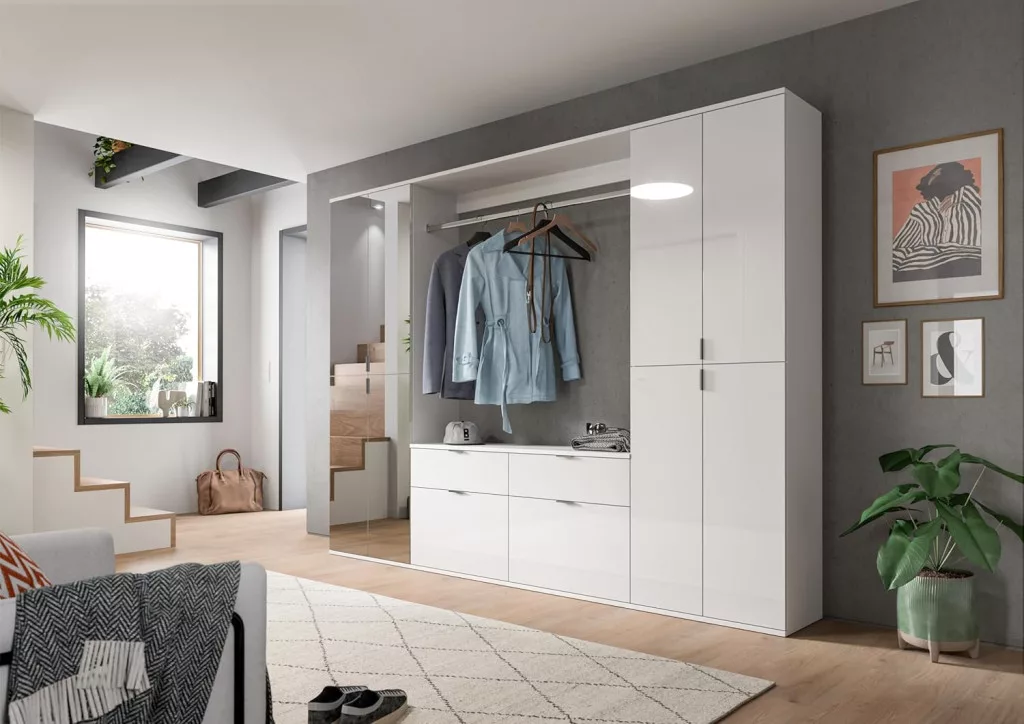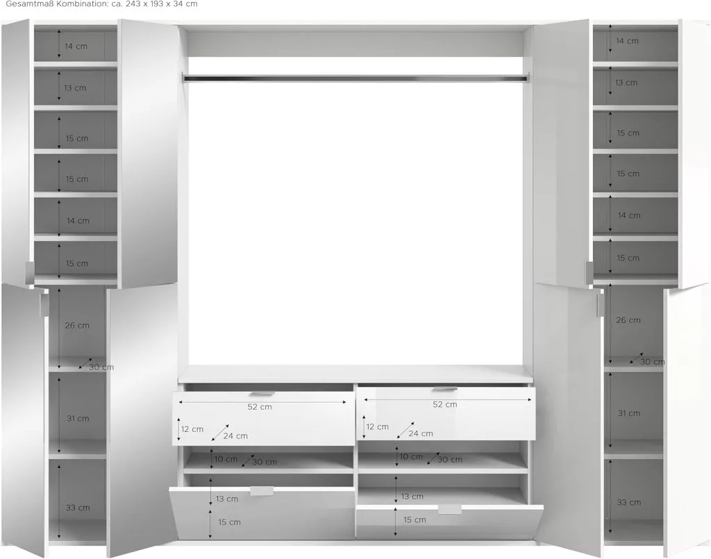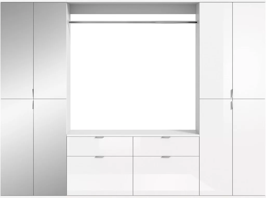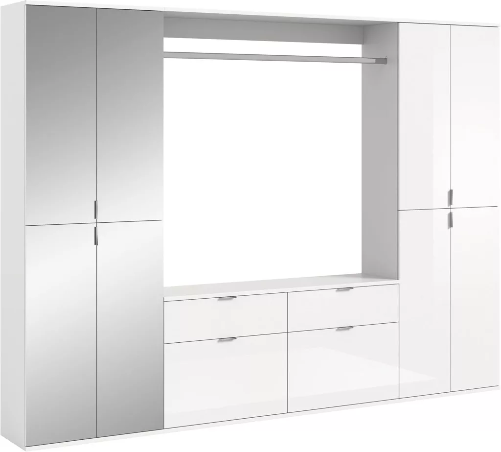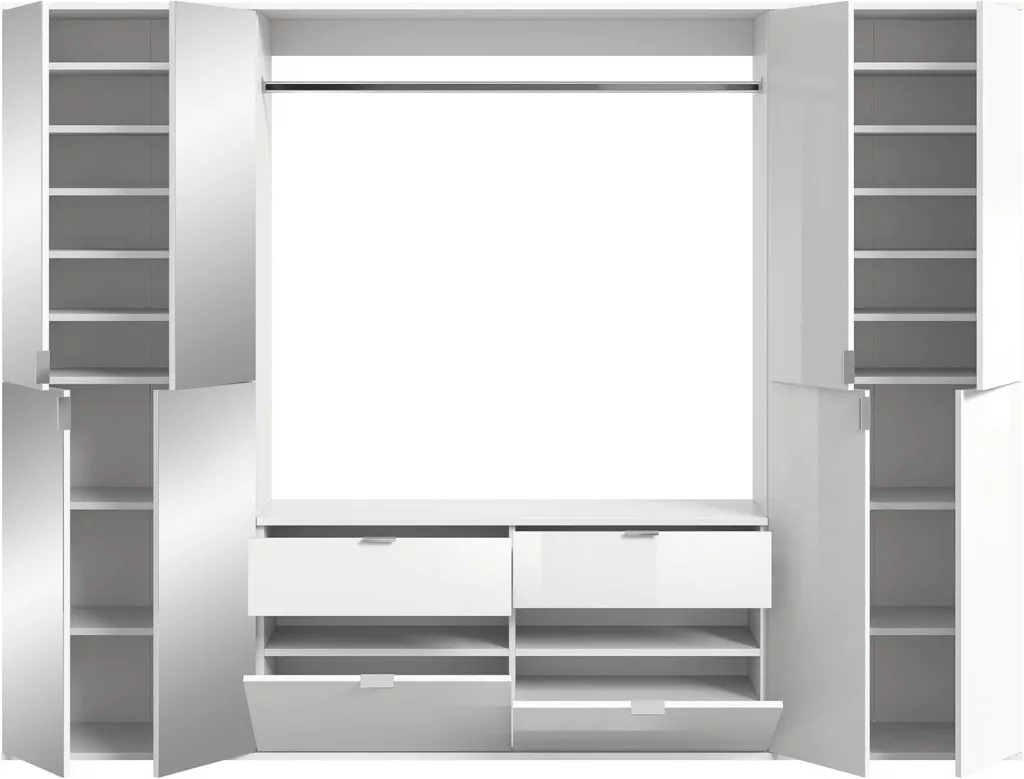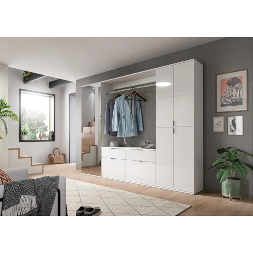 A fehér és magasfényű fehér színű gardróbszekrény-kombináció modern eleganciát sugároz, amit a fényes felület és a letisztult vonalak hangsúlyoznak. A magasfényű felület vonzó és modern megjelenést kölcsönöz a bútordarabnak, míg a fehérutánzat friss és világos összhatást biztosít. Ez az egyszerű, mégis stílusos dizájn jól illik különböző belső stílusokhoz, és világos, szellős hangulatot kölcsönöz a helyiségnek. Különböző tárolási lehetőségeivel a gardrób kombináció praktikus megoldást kínál ruhák, cipők és egyéb személyes tárgyak rendszerezésére. A ruhaakasztó rúd és a polcok kombinációja elegendő helyet kínál a sokoldalú felhasználáshoz. A magasfényű felület könnyen tisztítható és sima felületet kölcsönöz a bútordarabnak. A gardrób kombináció ideális különféle helyiségekbe, például fürdőszobába, gyerekszobába, hálószobába vagy akár egy lakásba. Praktikus és dekoratív bútordarabként is szolgálhat, amely rendet teremt, ugyanakkor vizuálisan is növeli a szobát.