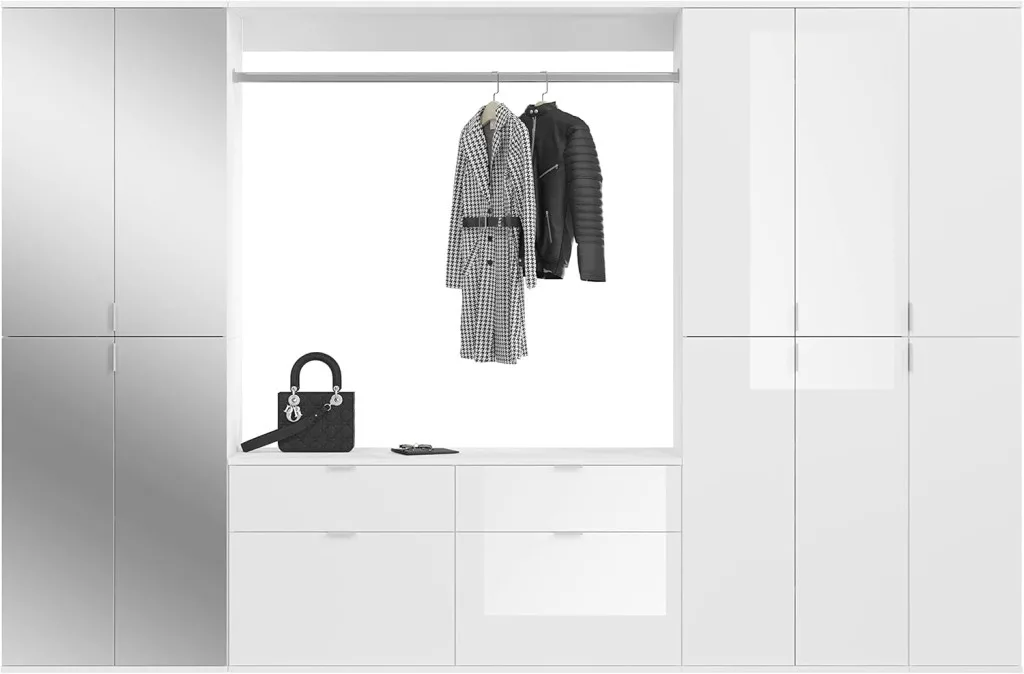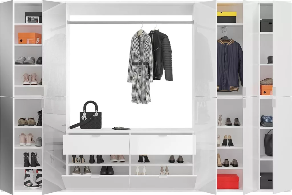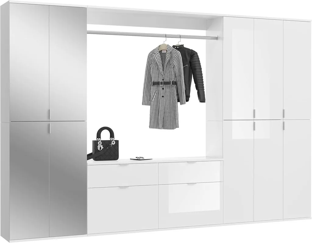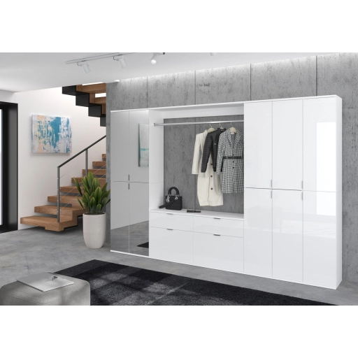 A fehér és magasfényű fehér színű gardróbszekrény-kombináció modern eleganciát sugároz, amit a fényes felület és a letisztult vonalak hangsúlyoznak. A magasfényű felület vonzó és modern megjelenést kölcsönöz a bútordarabnak, míg a fehérutánzat friss és világos összhatást biztosít. Ez az egyszerű, mégis stílusos dizájn jól illik különböző belső stílusokhoz, és világos, szellős hangulatot kölcsönöz a helyiségnek. Különböző tárolási lehetőségeivel a gardrób kombináció praktikus megoldást kínál ruhák, cipők és egyéb személyes tárgyak rendszerezésére. A ruhaakasztó rúd és a polcok kombinációja elegendő helyet kínál a sokoldalú felhasználáshoz. A magasfényű felület könnyen tisztítható és sima felületet kölcsönöz a bútordarabnak. A gardrób kombináció ideális különféle helyiségekbe, például fürdőszobába, gyerekszobába, hálószobába vagy akár egy lakásba. Praktikus és dekoratív bútordarabként is szolgálhat, amely rendet teremt, ugyanakkor vizuálisan is növeli a szobát.