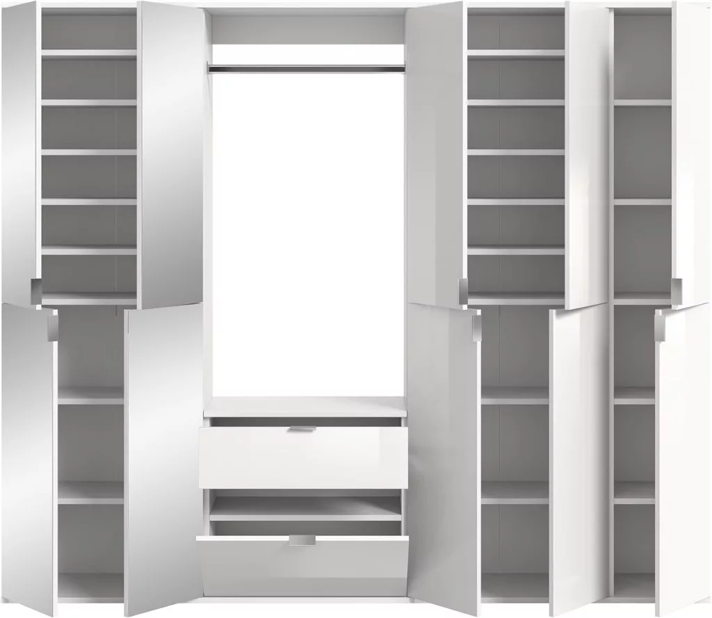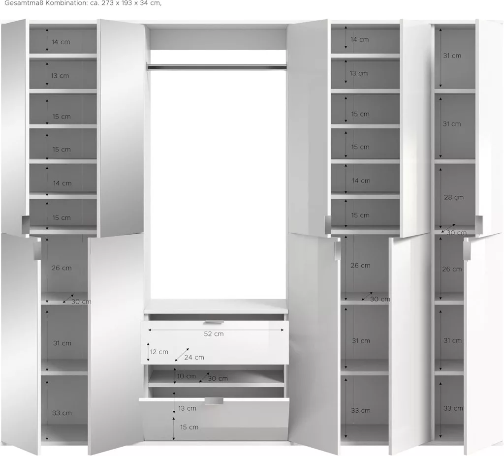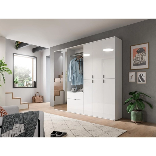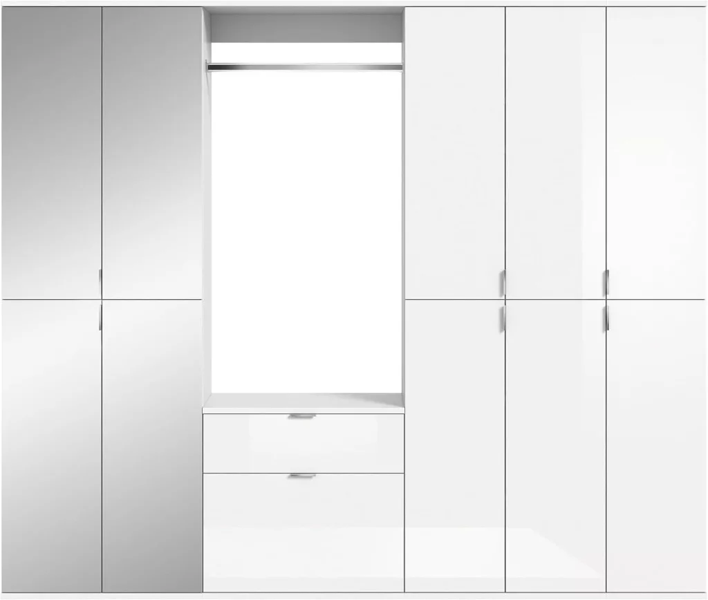 A fehér és magasfényű fehér színű gardróbszekrény-kombináció modern eleganciát sugároz, amit a fényes felület és a letisztult vonalak hangsúlyoznak. A magasfényű felület vonzó és modern megjelenést kölcsönöz a bútordarabnak, míg a fehérutánzat friss és világos összhatást biztosít. Ez az egyszerű, mégis stílusos dizájn jól illik különböző belső stílusokhoz, és világos, szellős hangulatot kölcsönöz a helyiségnek. Különböző tárolási lehetőségeivel a gardrób kombináció praktikus megoldást kínál ruhák, cipők és egyéb személyes tárgyak rendszerezésére. A ruhaakasztó rúd és a polcok kombinációja elegendő helyet kínál a sokoldalú felhasználáshoz. A magasfényű felület könnyen tisztítható és sima felületet kölcsönöz a bútordarabnak. A gardrób kombináció ideális különféle helyiségekbe, például fürdőszobába, gyerekszobába, hálószobába vagy akár egy lakásba. Praktikus és dekoratív bútordarabként is szolgálhat, amely rendet teremt, ugyanakkor vizuálisan is növeli a szobát.