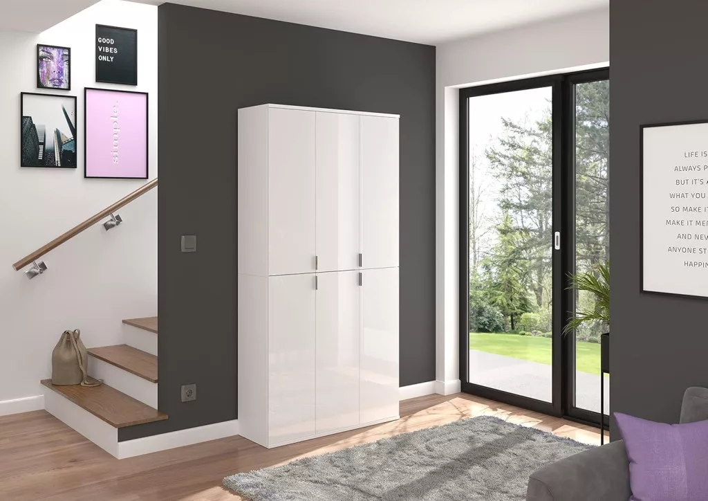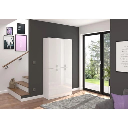 A fehér és magasfényű fehér színű gardróbszekrény-kombináció modern eleganciát sugároz, amit a fényes felület és a letisztult vonalak hangsúlyoznak. A magasfényű felület vonzó és modern megjelenést kölcsönöz a bútordarabnak, míg a fehérutánzat friss és világos összhatást biztosít. Ez az egyszerű, mégis stílusos dizájn jól illik különböző belső stílusokhoz, és világos, szellős hangulatot kölcsönöz a helyiségnek. Különböző tárolási lehetőségeivel a gardrób kombináció praktikus megoldást kínál ruhák, cipők és egyéb személyes tárgyak rendszerezésére. A ruhaakasztó rúd és a polcok kombinációja elegendő helyet kínál a sokoldalú felhasználáshoz. A magasfényű felület könnyen tisztítható és sima felületet kölcsönöz a bútordarabnak. A gardrób kombináció ideális különféle helyiségekbe, például fürdőszobába, gyerekszobába, hálószobába vagy akár egy lakásba. Praktikus és dekoratív bútordarabként is szolgálhat, amely rendet teremt, ugyanakkor vizuálisan is növeli a szobát.