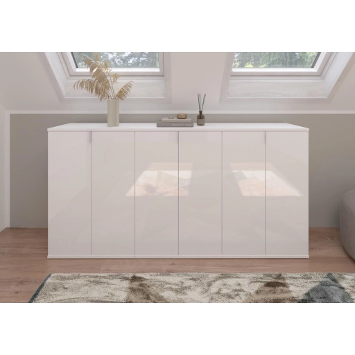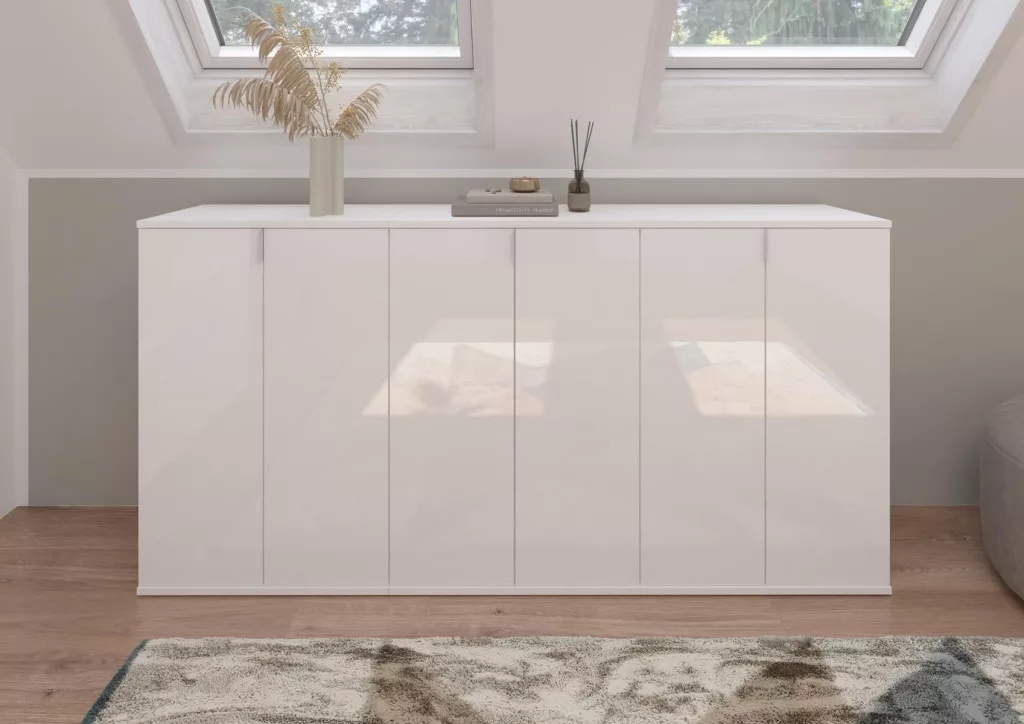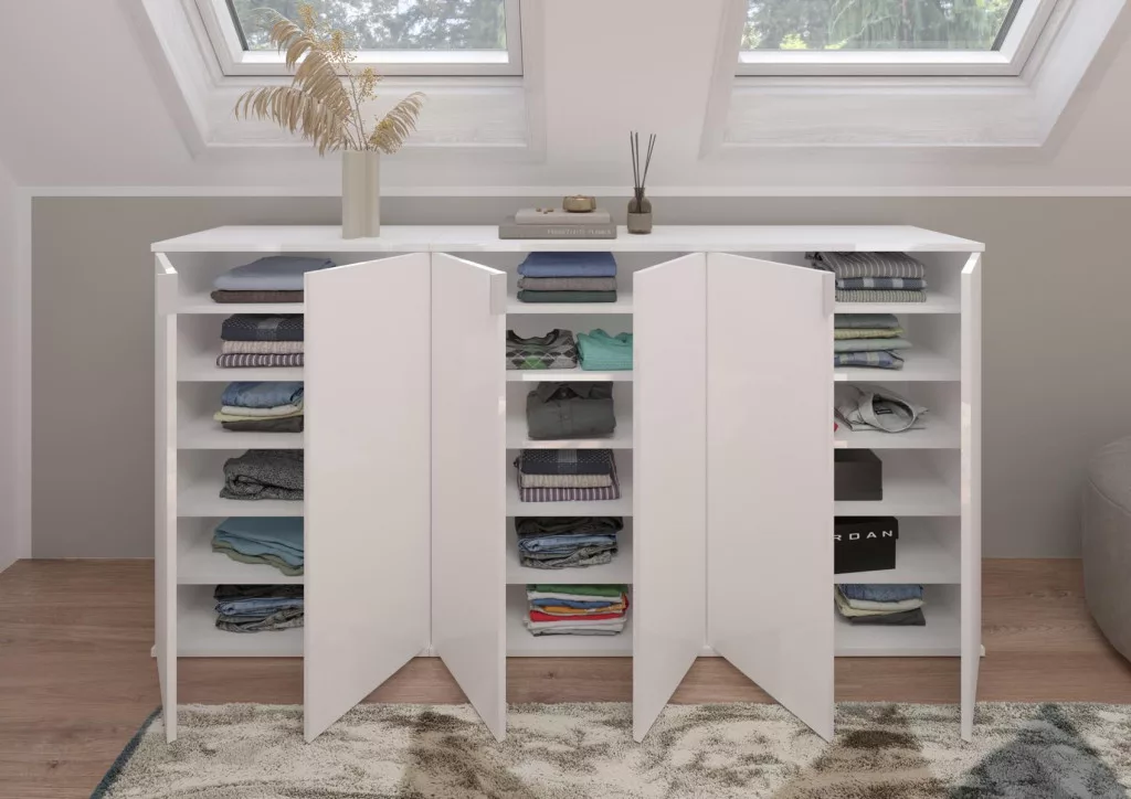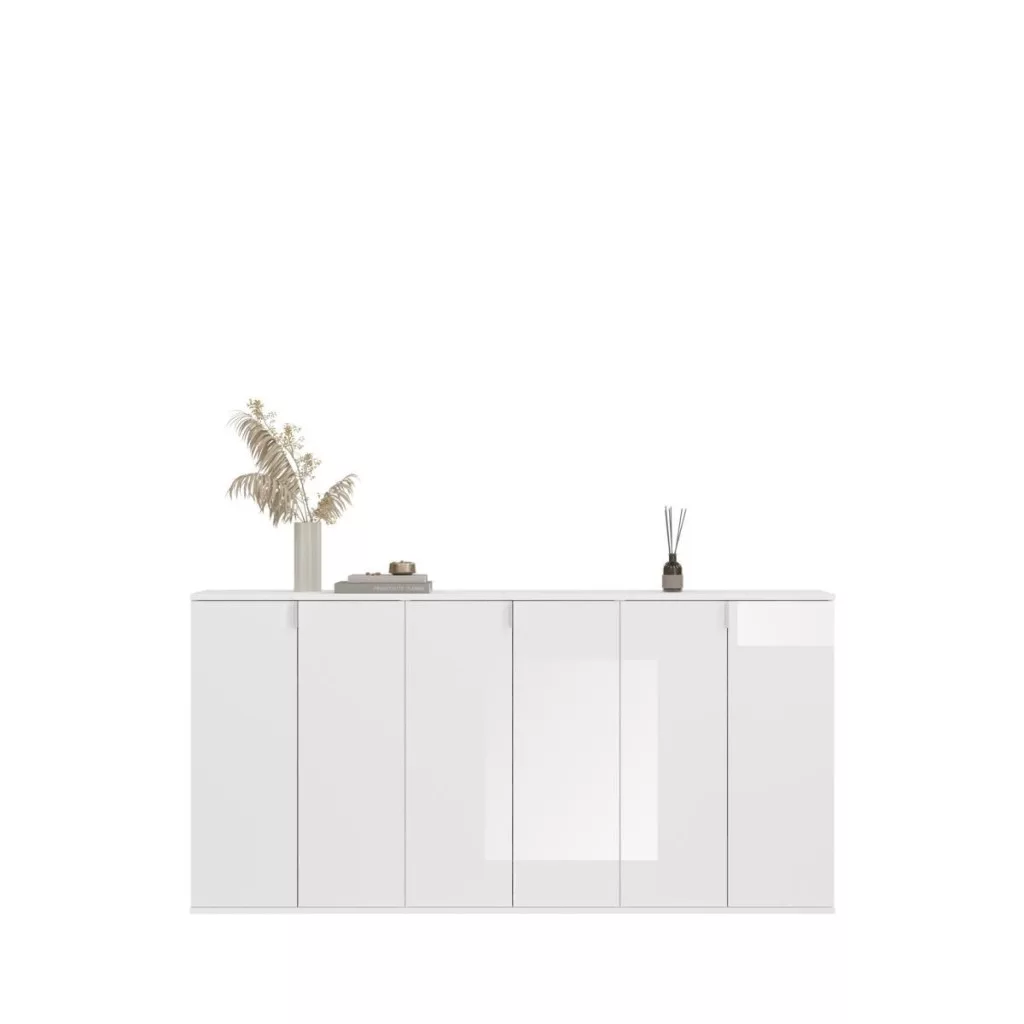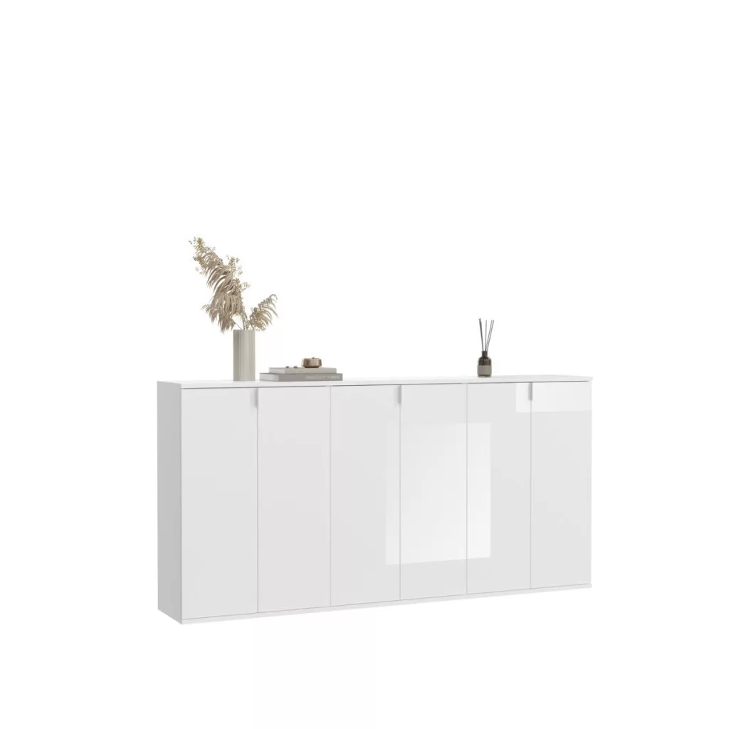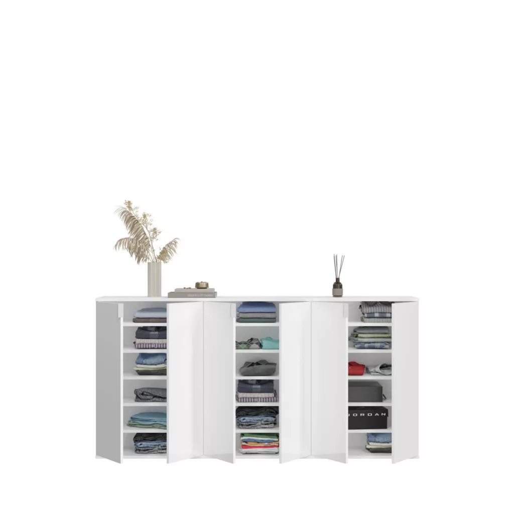A fehér és magasfényű fehér színű gardróbszekrény-kombináció modern eleganciát sugároz, amit a fényes felület és a letisztult vonalak hangsúlyoznak. A magasfényű felület vonzó és modern megjelenést kölcsönöz a bútordarabnak, míg a fehérutánzat friss és világos összhatást biztosít. Ez az egyszerű, mégis stílusos dizájn jól illik különböző belső stílusokhoz, és világos, szellős hangulatot kölcsönöz a helyiségnek. Különböző tárolási lehetőségeivel a gardrób kombináció praktikus megoldást kínál ruhák, cipők és egyéb személyes tárgyak rendszerezésére. A ruhaakasztó rúd és a polcok kombinációja elegendő helyet kínál a sokoldalú felhasználáshoz. A magasfényű felület könnyen tisztítható és sima felületet kölcsönöz a bútordarabnak. A gardrób kombináció ideális különféle helyiségekbe, például fürdőszobába, gyerekszobába, hálószobába vagy akár egy lakásba. Praktikus és dekoratív bútordarabként is szolgálhat, amely rendet teremt, ugyanakkor vizuálisan is növeli a szobát.