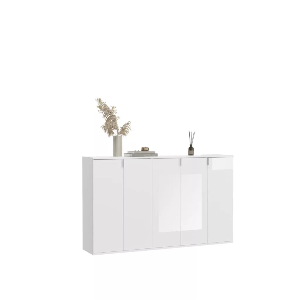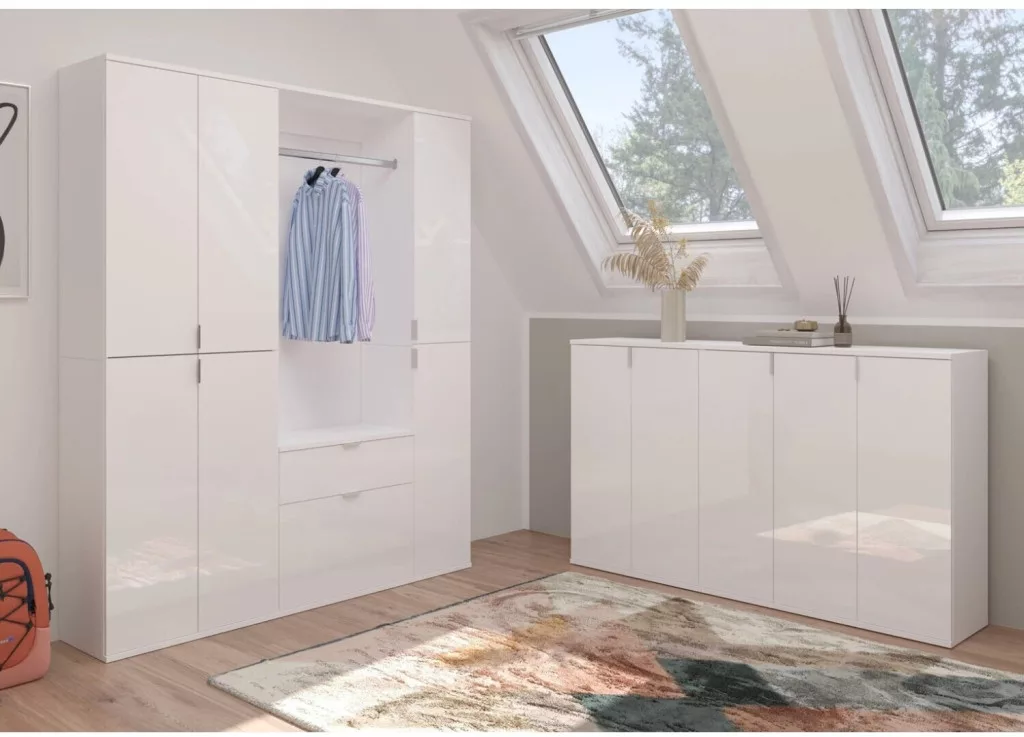 A fehér és magasfényű fehér színű gardróbszekrény-kombináció modern eleganciát sugároz, amit a fényes felület és a letisztult vonalak hangsúlyoznak. A magasfényű felület vonzó és modern megjelenést kölcsönöz a bútordarabnak, míg a fehérutánzat friss és világos összhatást biztosít. Ez az egyszerű, mégis stílusos dizájn jól illik különböző belső stílusokhoz, és világos, szellős hangulatot kölcsönöz a helyiségnek. Különböző tárolási lehetőségeivel a gardrób kombináció praktikus megoldást kínál ruhák, cipők és egyéb személyes tárgyak rendszerezésére. A ruhaakasztó rúd és a polcok kombinációja elegendő helyet kínál a sokoldalú felhasználáshoz. A magasfényű felület könnyen tisztítható és sima felületet kölcsönöz a bútordarabnak. A gardrób kombináció ideális különféle helyiségekbe, például fürdőszobába, gyerekszobába, hálószobába vagy akár egy lakásba. Praktikus és dekoratív bútordarabként is szolgálhat, amely rendet teremt, ugyanakkor vizuálisan is növeli a szobát.