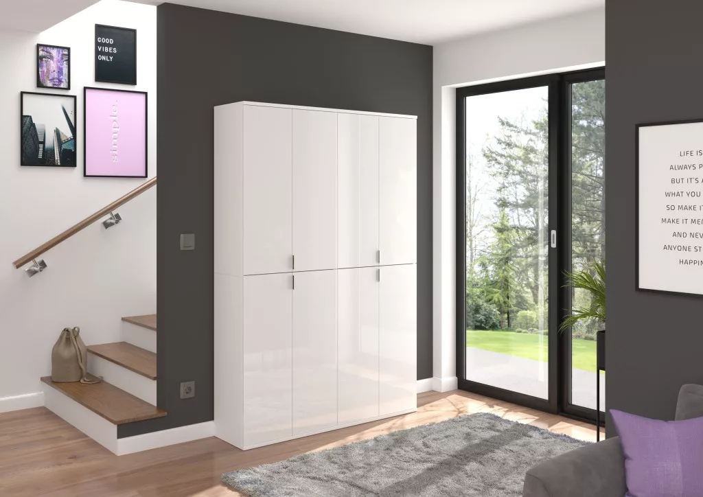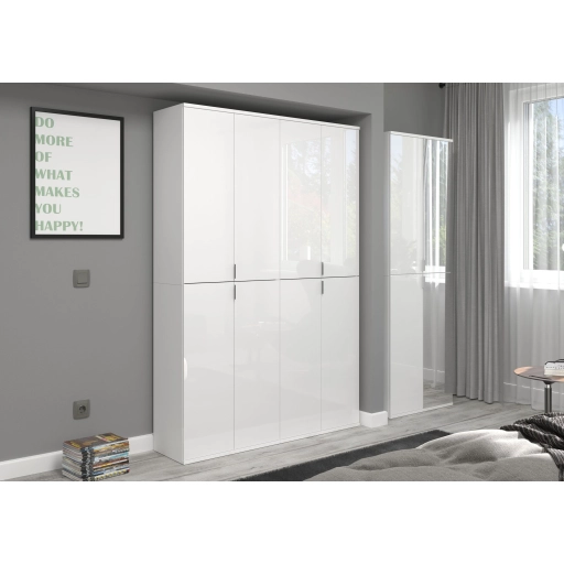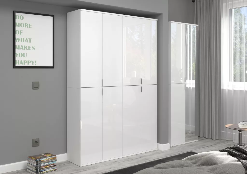 A fehér és magasfényű fehér színű gardróbszekrény-kombináció modern eleganciát sugároz, amit a fényes felület és a letisztult vonalak hangsúlyoznak. A magasfényű felület vonzó és modern megjelenést kölcsönöz a bútordarabnak, míg a fehérutánzat friss és világos összhatást biztosít. Ez az egyszerű, mégis stílusos dizájn jól illik különböző belső stílusokhoz, és világos, szellős hangulatot kölcsönöz a helyiségnek. Különböző tárolási lehetőségeivel a gardrób kombináció praktikus megoldást kínál ruhák, cipők és egyéb személyes tárgyak rendszerezésére. A ruhaakasztó rúd és a polcok kombinációja elegendő helyet kínál a sokoldalú felhasználáshoz. A magasfényű felület könnyen tisztítható és sima felületet kölcsönöz a bútordarabnak. A gardrób kombináció ideális különféle helyiségekbe, például fürdőszobába, gyerekszobába, hálószobába vagy akár egy lakásba. Praktikus és dekoratív bútordarabként is szolgálhat, amely rendet teremt, ugyanakkor vizuálisan is növeli a szobát.