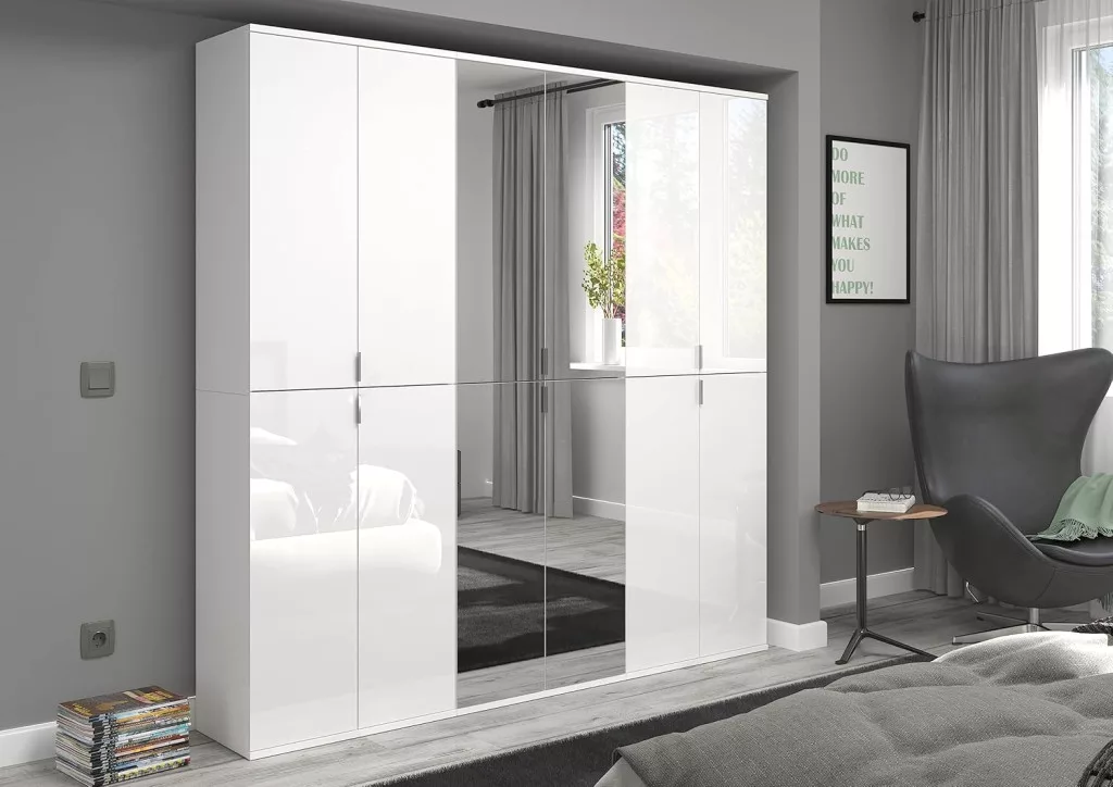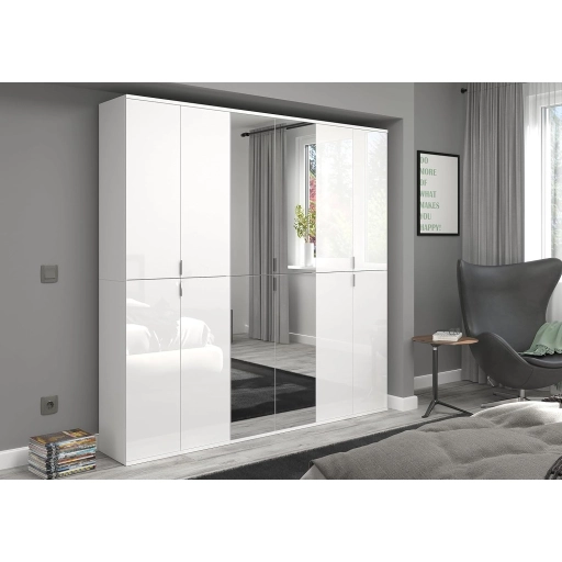 A fehér és magasfényű fehér színű gardróbszekrény-kombináció modern eleganciát sugároz, amit a fényes felület és a letisztult vonalak hangsúlyoznak. A magasfényű felület vonzó és modern megjelenést kölcsönöz a bútordarabnak, míg a fehérutánzat friss és világos összhatást biztosít. Ez az egyszerű, mégis stílusos dizájn jól illik különböző belső stílusokhoz, és világos, szellős hangulatot kölcsönöz a helyiségnek. Különböző tárolási lehetőségeivel a gardrób kombináció praktikus megoldást kínál ruhák, cipők és egyéb személyes tárgyak rendszerezésére. A ruhaakasztó rúd és a polcok kombinációja elegendő helyet kínál a sokoldalú felhasználáshoz. A magasfényű felület könnyen tisztítható és sima felületet kölcsönöz a bútordarabnak. A gardrób kombináció ideális különféle helyiségekbe, például fürdőszobába, gyerekszobába, hálószobába vagy akár egy lakásba. Praktikus és dekoratív bútordarabként is szolgálhat, amely rendet teremt, ugyanakkor vizuálisan is növeli a szobát.
