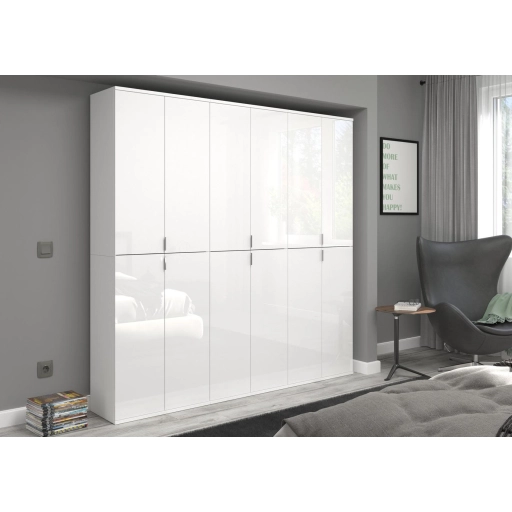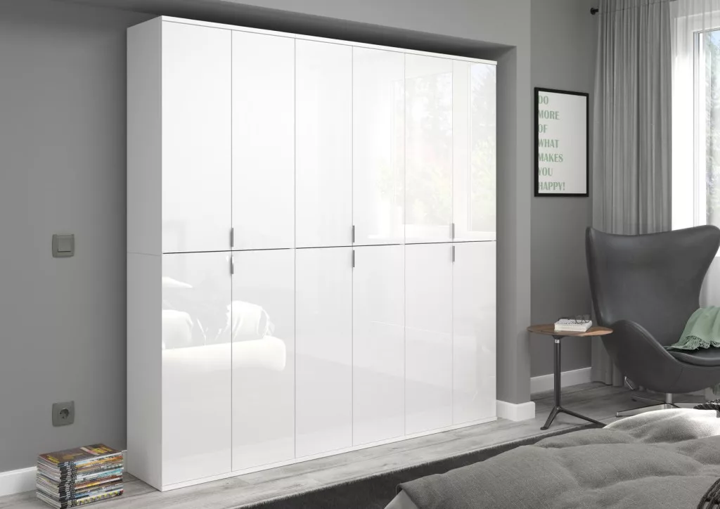 A fehér és magasfényű fehér színű gardróbszekrény-kombináció modern eleganciát sugároz, amit a fényes felület és a letisztult vonalak hangsúlyoznak. A magasfényű felület vonzó és modern megjelenést kölcsönöz a bútordarabnak, míg a fehérutánzat friss és világos összhatást biztosít. Ez az egyszerű, mégis stílusos dizájn jól illik különböző belső stílusokhoz, és világos, szellős hangulatot kölcsönöz a helyiségnek. Különböző tárolási lehetőségeivel a gardrób kombináció praktikus megoldást kínál ruhák, cipők és egyéb személyes tárgyak rendszerezésére. A ruhaakasztó rúd és a polcok kombinációja elegendő helyet kínál a sokoldalú felhasználáshoz. A magasfényű felület könnyen tisztítható és sima felületet kölcsönöz a bútordarabnak. A gardrób kombináció ideális különféle helyiségekbe, például fürdőszobába, gyerekszobába, hálószobába vagy akár egy lakásba. Praktikus és dekoratív bútordarabként is szolgálhat, amely rendet teremt, ugyanakkor vizuálisan is növeli a szobát.