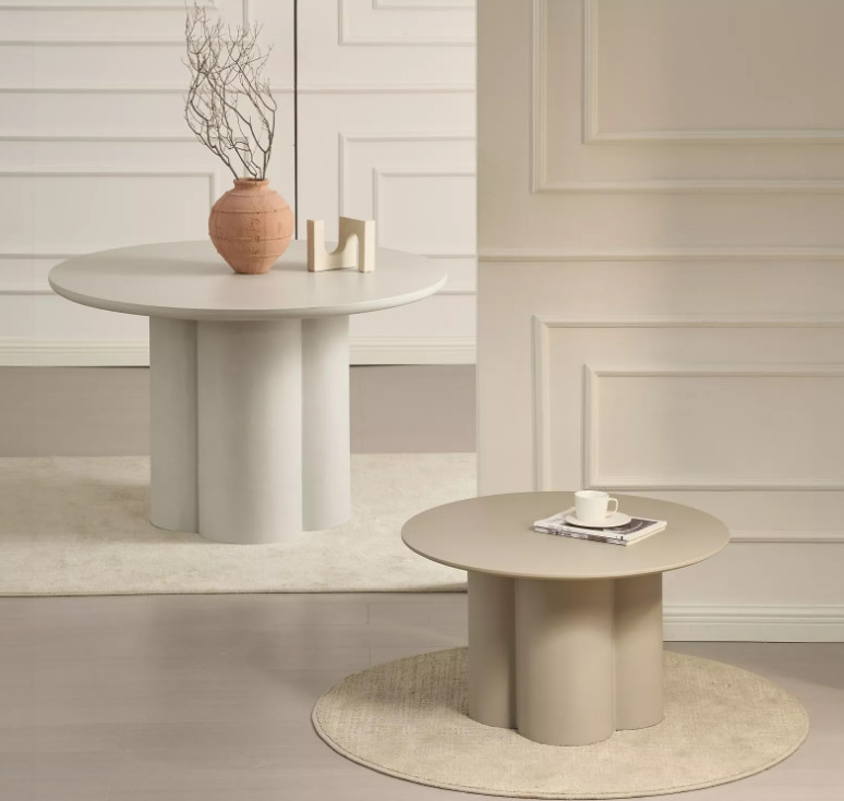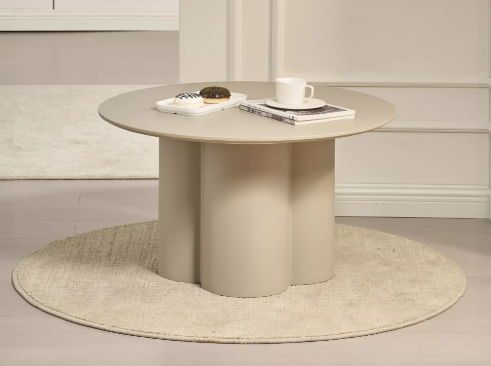 Modern, kerek dohányzóasztal, amely letisztult formájával és egységes felületével illeszkedik a kortárs nappalikba. Az asztallap és a váz egyaránt lakkozott MDF-ből készül, így homogén, sima felületet ad, visszafogott, matt megjelenéssel.