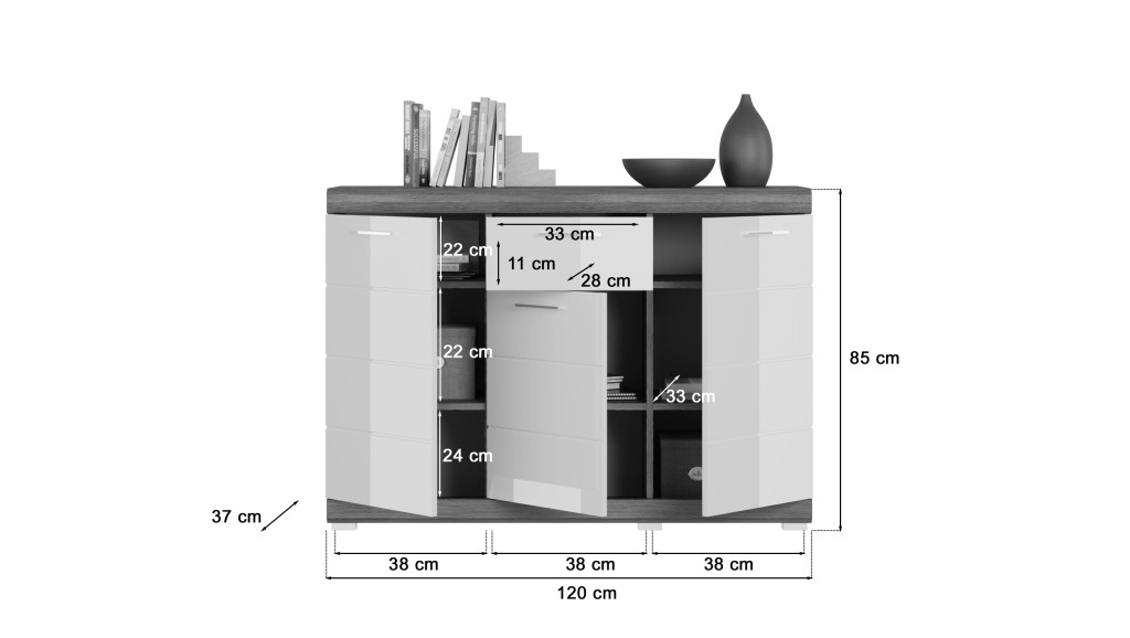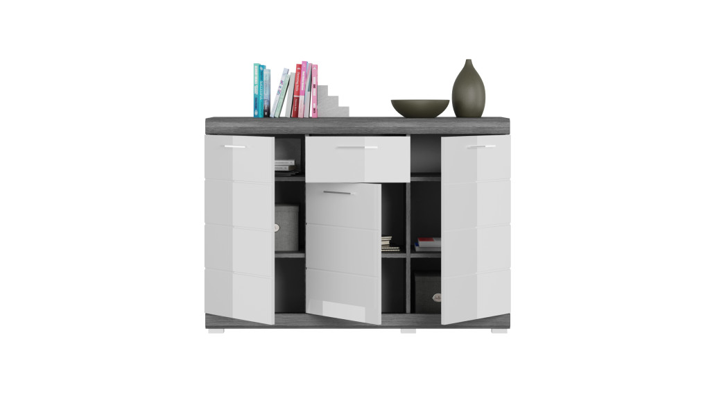 A Scout komód a modern dizájnt ötvözi a kifinomult funkcionalitással – ideális előszobába, nappaliba vagy hálószobába. 120 × 85 × 37 cm-es kompakt méretében bőséges tárolóhelyet kínál. A három csuklós ajtó mögött öt polc található, amelyek lehetővé teszik a tárgyak rugalmas rendszerezését. Egy további, teljesen kihúzható fiók ideális kisebb tárgyak tárolására. A füstezüst színű test és a fehér, magasfényű előlap kombinációja modern megjelenést kölcsönöz a komódnak, amely harmonikusan illeszkedik a különféle belső stílusokhoz. Melamin bevonatú, FSC® tanúsítvánnyal rendelkező fából készült bútordarab tartósságával és könnyű kezelhetőségével lenyűgöző. Krómhatású műanyag fogantyúk és ezüst színű műanyag lábak teszik teljessé a dizájnt.