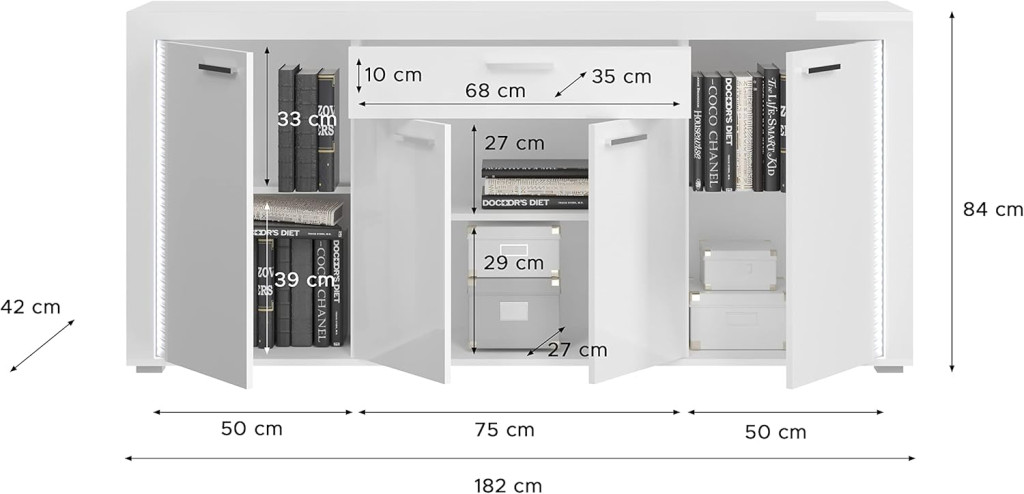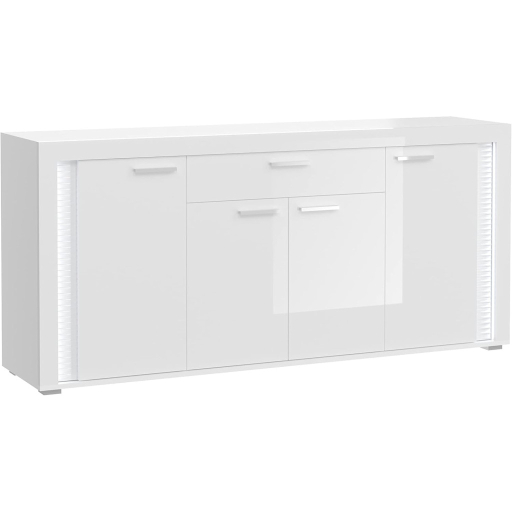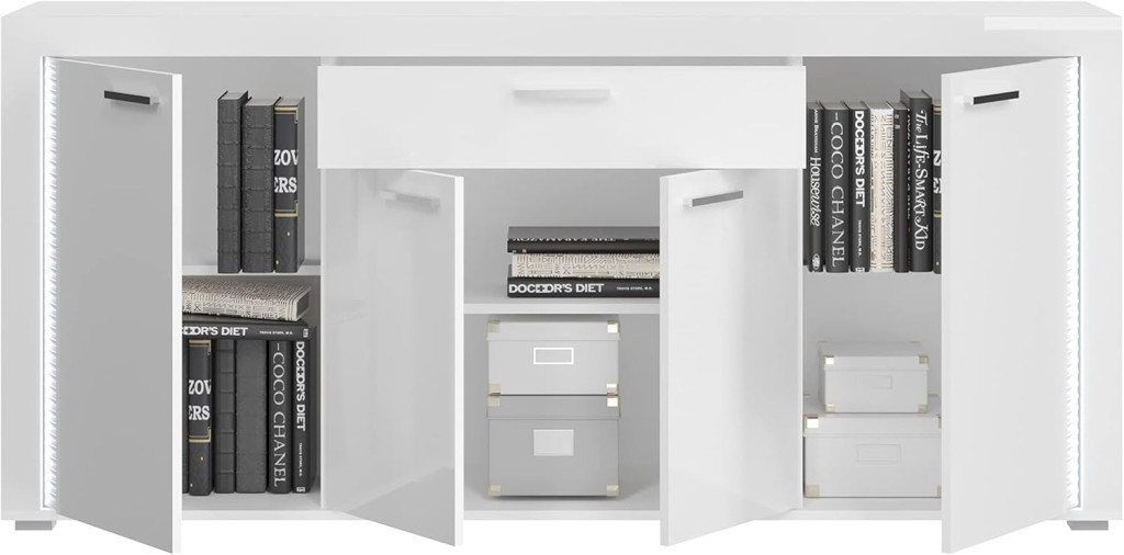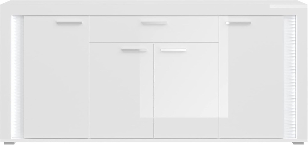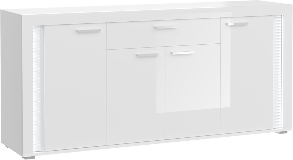 A fehér és magasfényű fehér tálalószekrény modern és elegáns dizájnnal rendelkezik, amely fényes felületének és letisztult vonalainak köszönhetően modern, ugyanakkor egyszerű és vonzó esztétikát teremt a nappaliban. Bőséges tárolóhelyével és széles felületével a tálalószekrény funkcionális megoldást kínál edények, evőeszközök, dísztárgyak és egyéb mindennapi tárgyak tárolására, javítva a szoba rendszerezését és hatékonyságát. A tálalószekrény ideális a nappaliba, és stílusos kiegészítője lehet különféle lakótereknek, tárolóhelyet teremtve, miközben fokozza a szoba megjelenését.