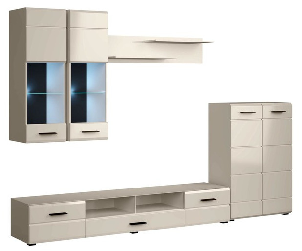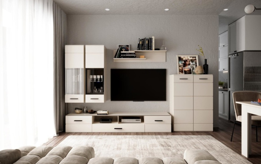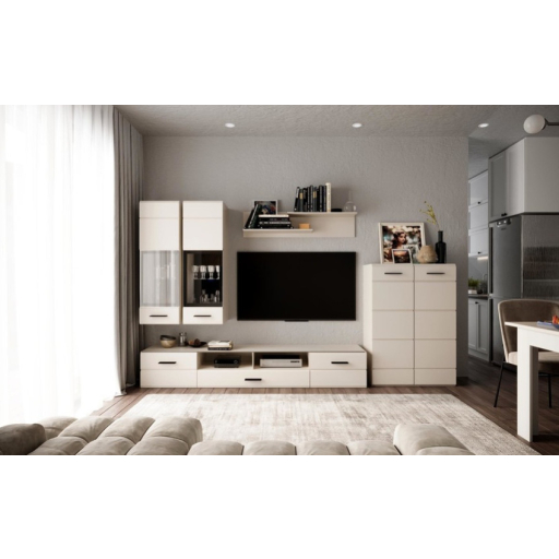 A világos krémszínű felületek és a fekete fogantyúk kontrasztja finom, mégis karakteres megjelenést biztosít, amely bármely nappali központi elemévé válhat.