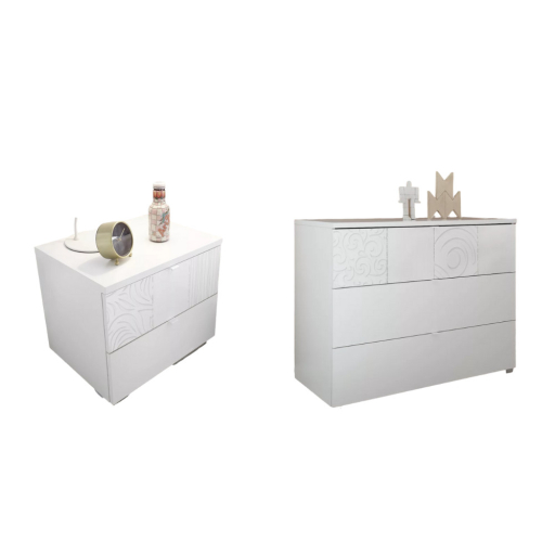 A Xaos komód egy kifejezetten egyedi bútordarab, elegáns, fehér színű szitanyomással korszerű, friss és innovatív hangulatot kölcsönöz a szobának. A fiókok közepén elhelyezett fogtyúk kis mérete még különlegesebbé teszi a komódot.